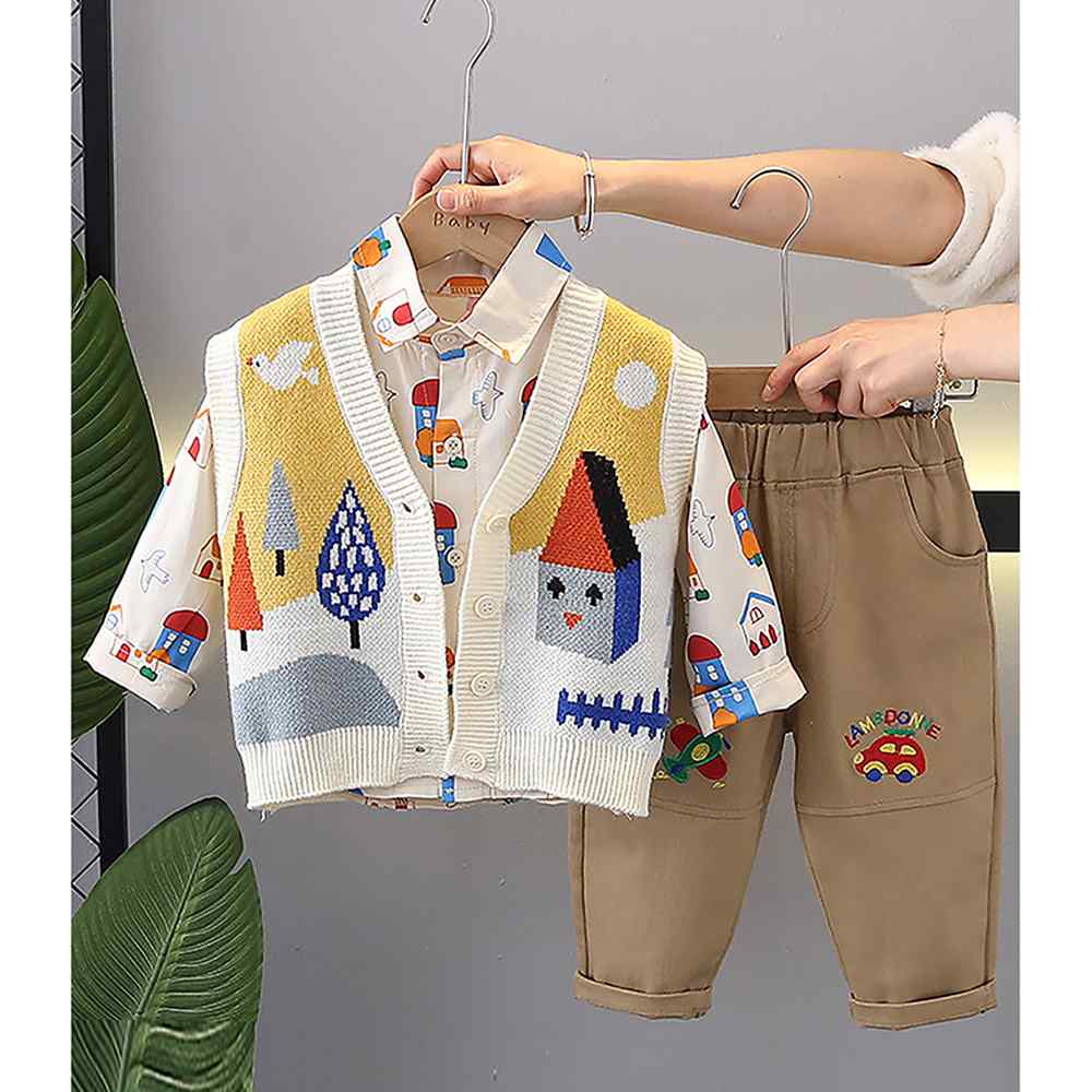 3pcs Yellow Village Theme Cardigan, Shirt and matching Pants set for Toddlers and Kids, winter and all season wear