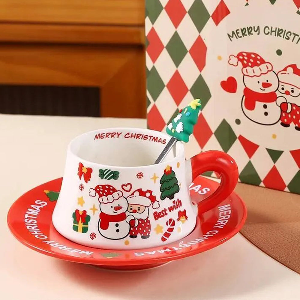 Snowman with Santa Christmas themed Ceramic Cup & Saucer with 3D Christmas Tree Spoon Gift Box Set