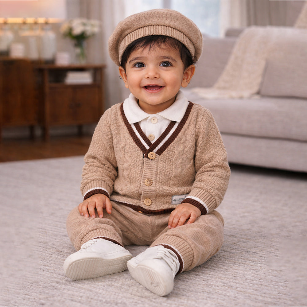 2 Pcs Beige Brown Bordered Winter Knit Cardigan & Pants with Beret Cap for Infants