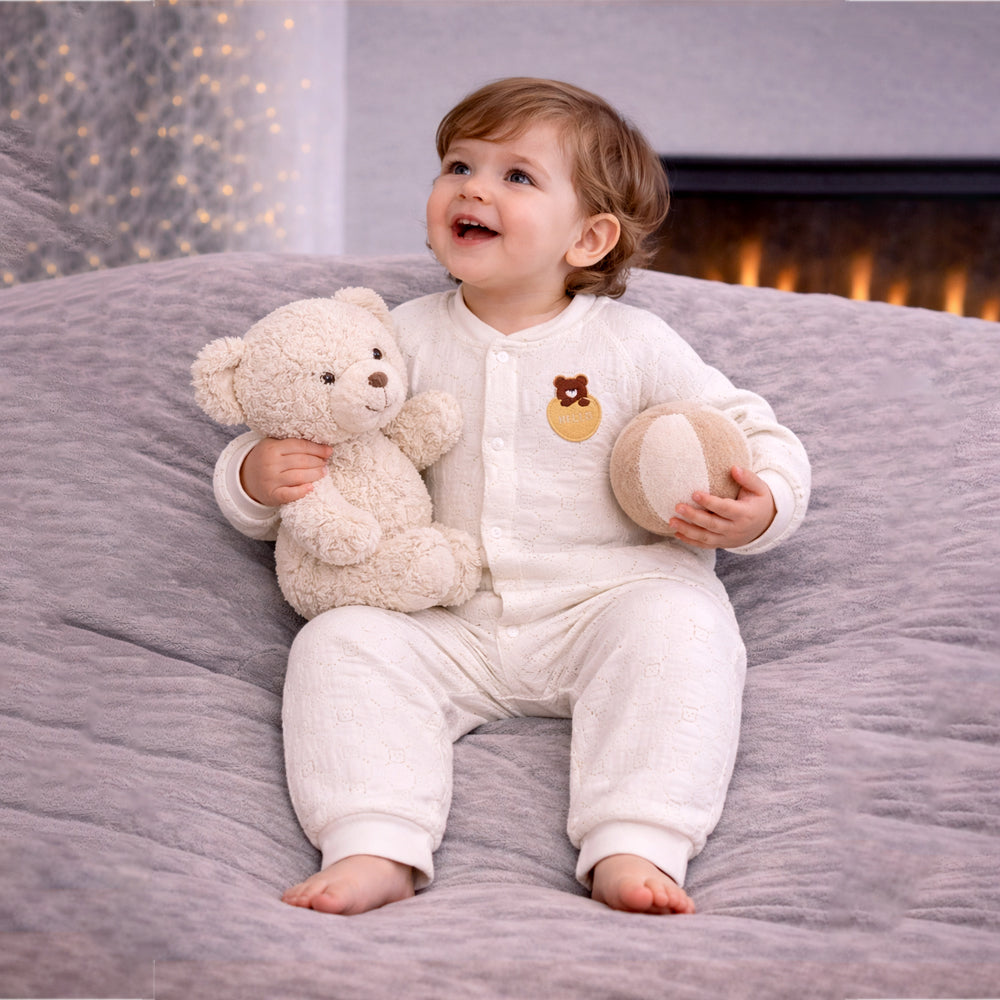 Cream Teddy All-Over Print, Full Sleeves Jumpsuit Hoodie Romper for Tiny Toddlers