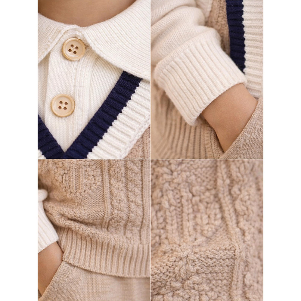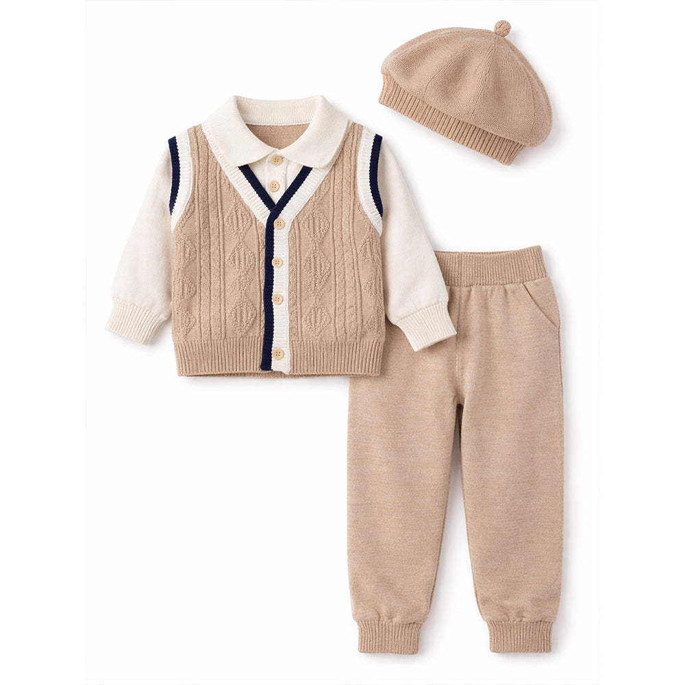 1. Design: This cute winter set includes a soft beige knitted cardigan with a cream collar, navy trim, and a vest-style design, along with matching beige pants. It also comes with a beret- style cap to complete the look. The simple and stylish design keeps your baby looking neat and adorable.