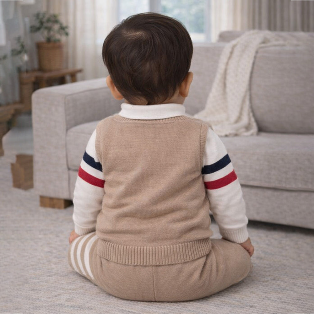 2 Pcs Beige with Red-Navy Stripes Sleeves Winter Cardigan & Pant for Infants