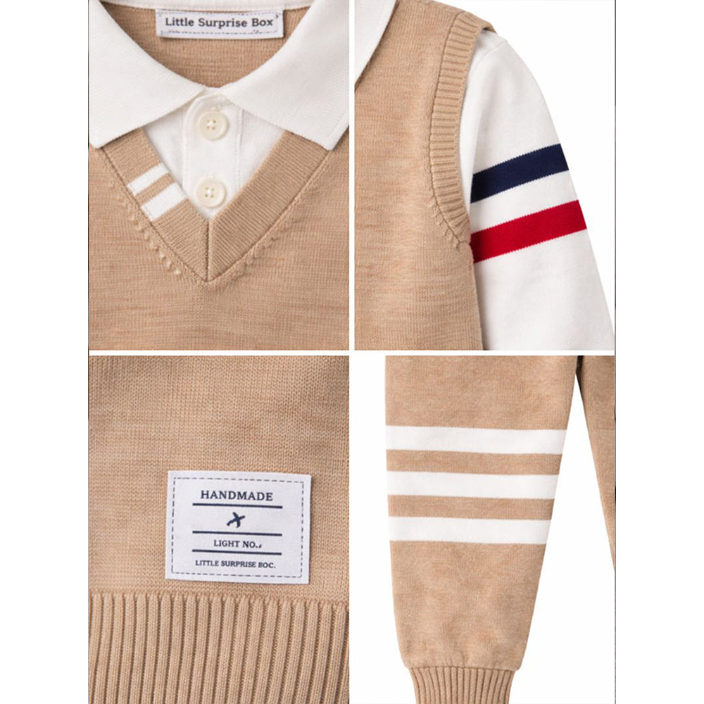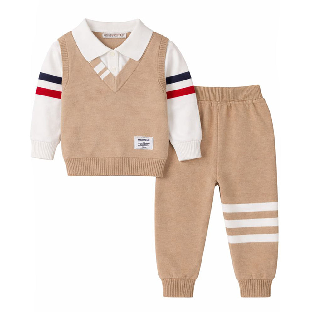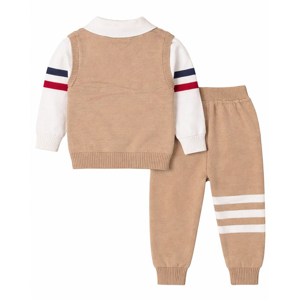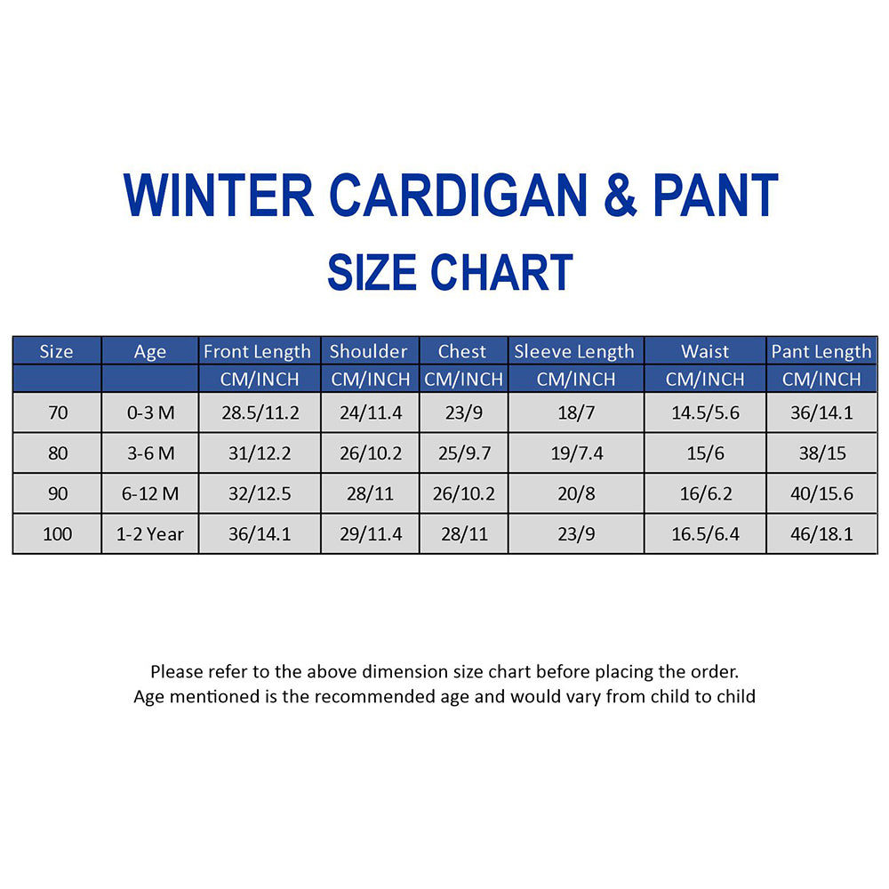 1. Design: This cute winter set includes a soft beige cardigan with a cream collar and red-navy stripes on the sleeves paired with matching beige pants. The simple and stylish design keeps your baby looking neat and adorable.