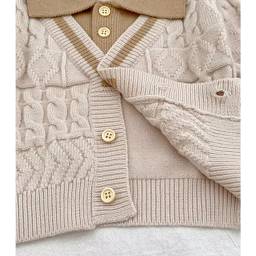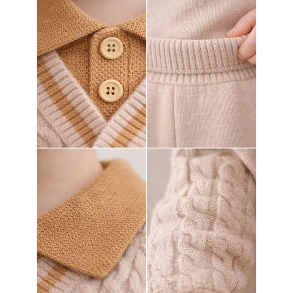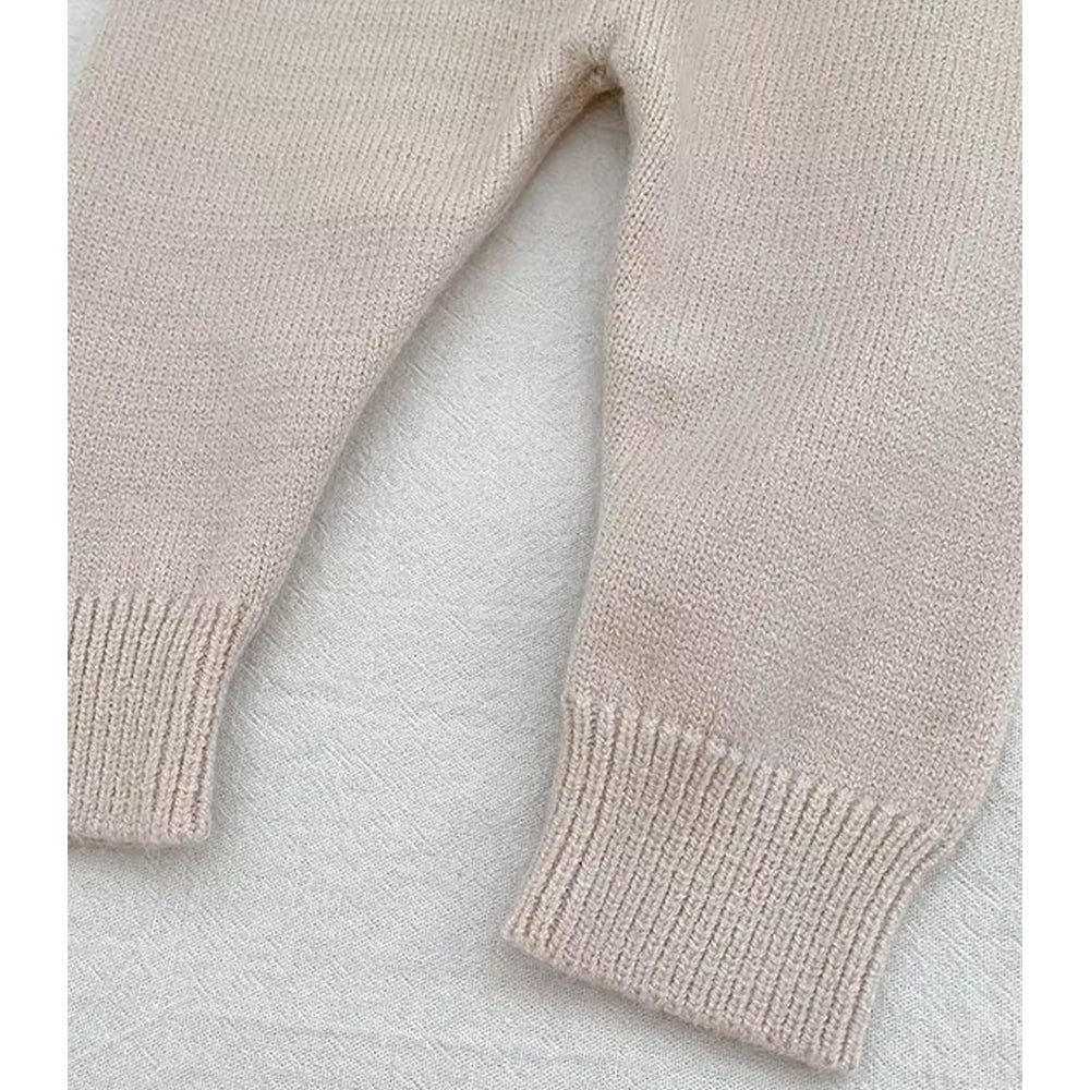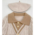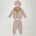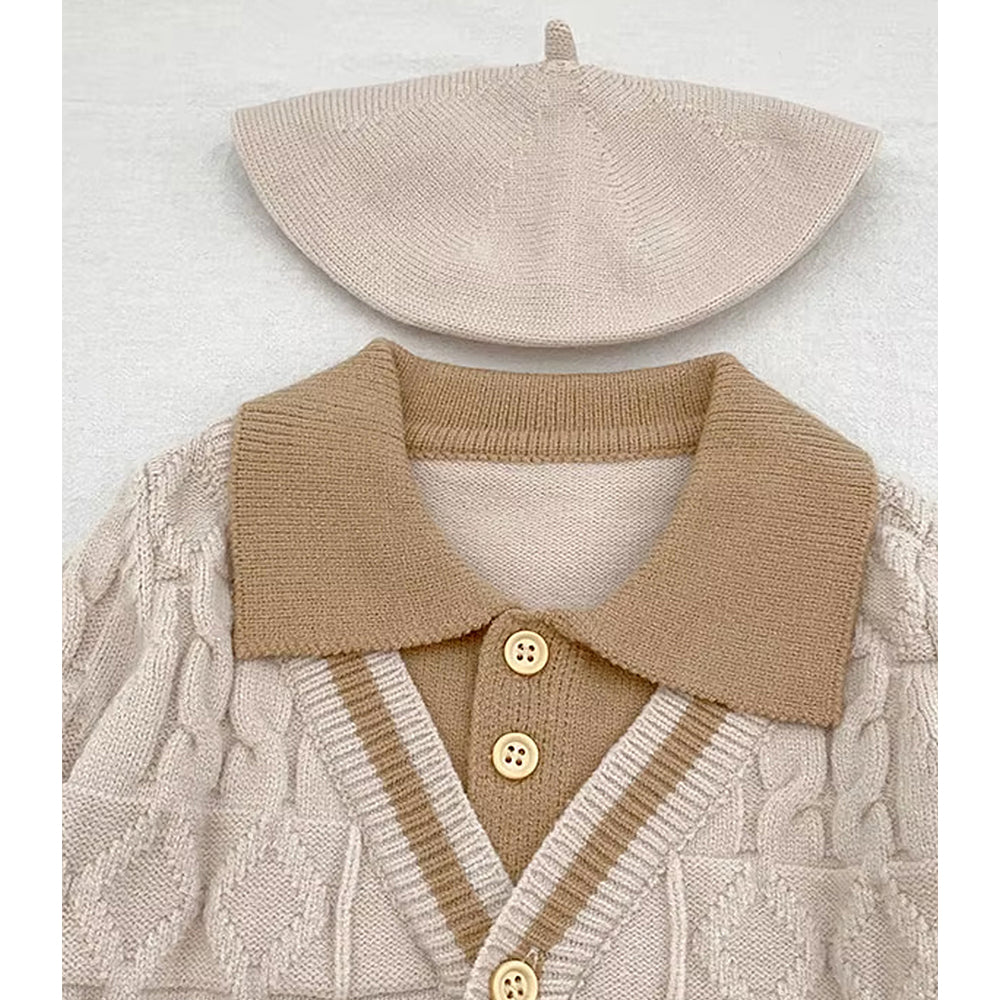 2 Pcs Cream Beige Collar Winter Cardigan & Pants with Beret-Style Cap for Infants