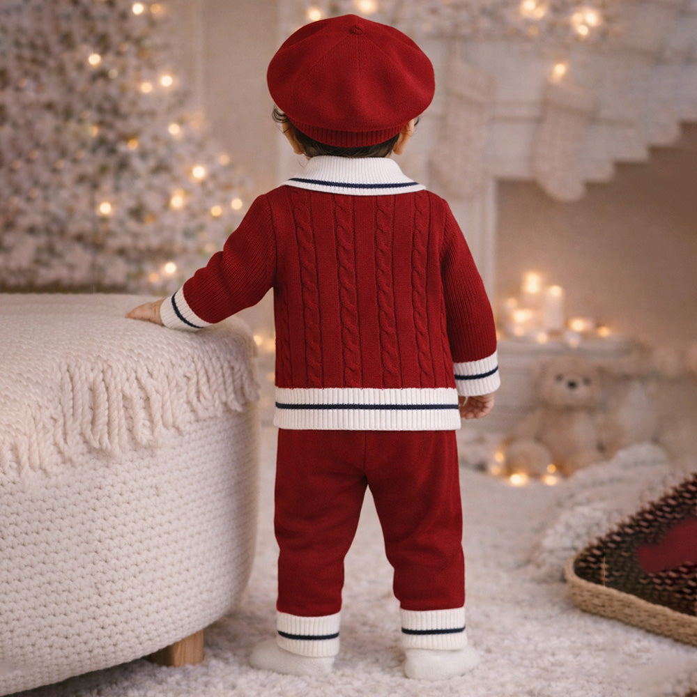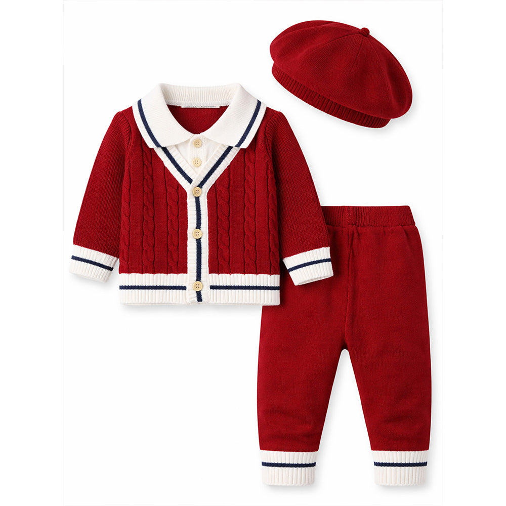 2 Pcs Maroon Navy Border Winter Knit Cardigan & Pants with Beret Cap for Infants