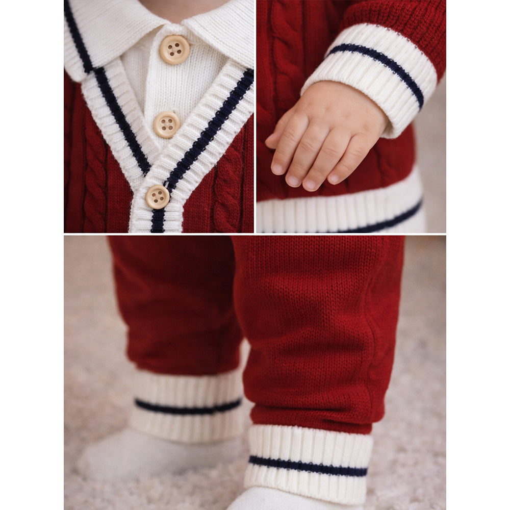 1. Design: This cute winter set includes a maroon knitted cardigan with a cream collar and matching pants with navy border. It also comes with a beret- style cap to complete the look. The simple and stylish design keeps your baby looking neat and adorable.