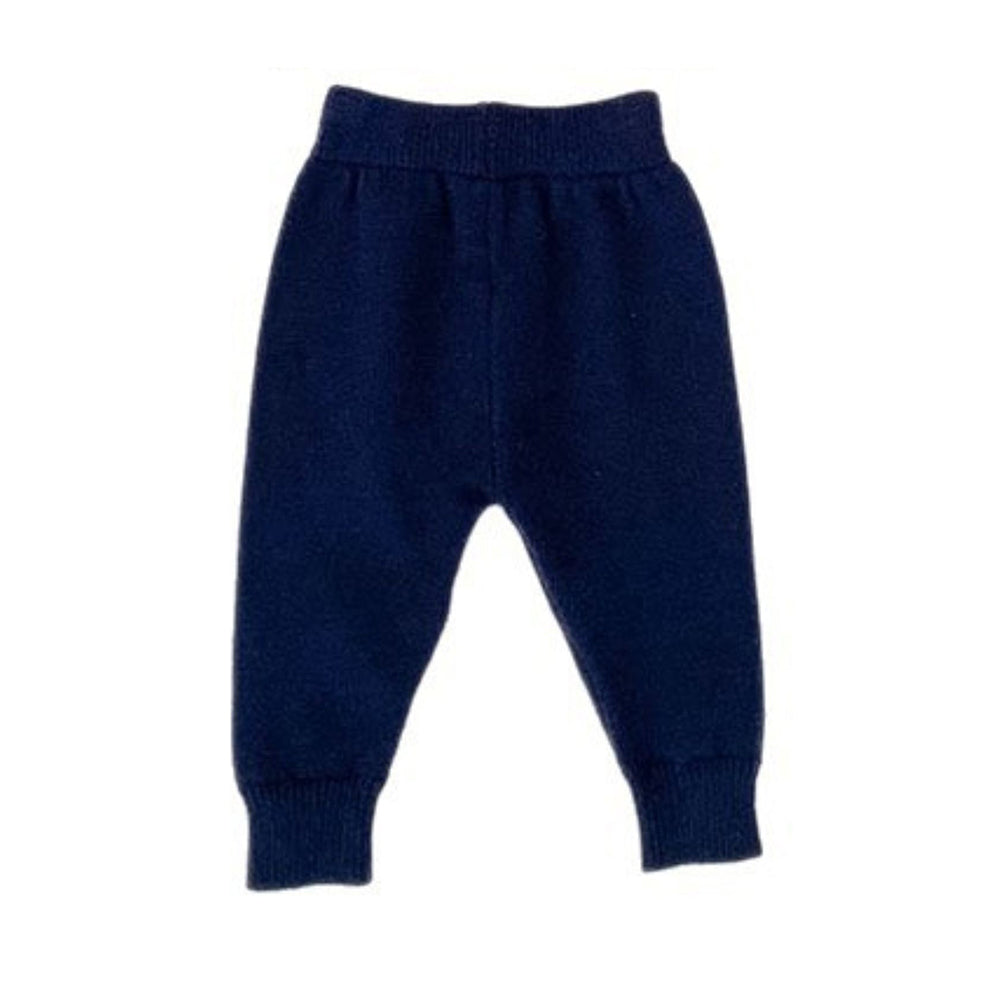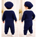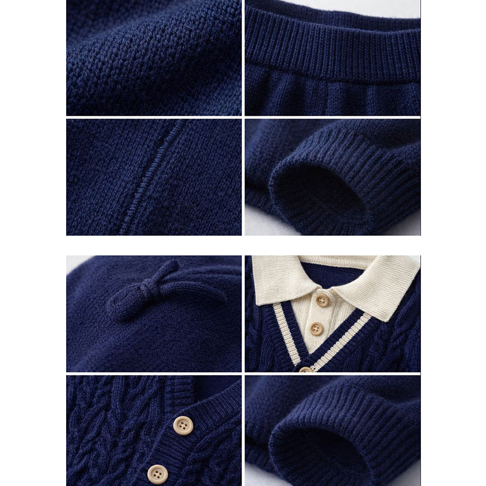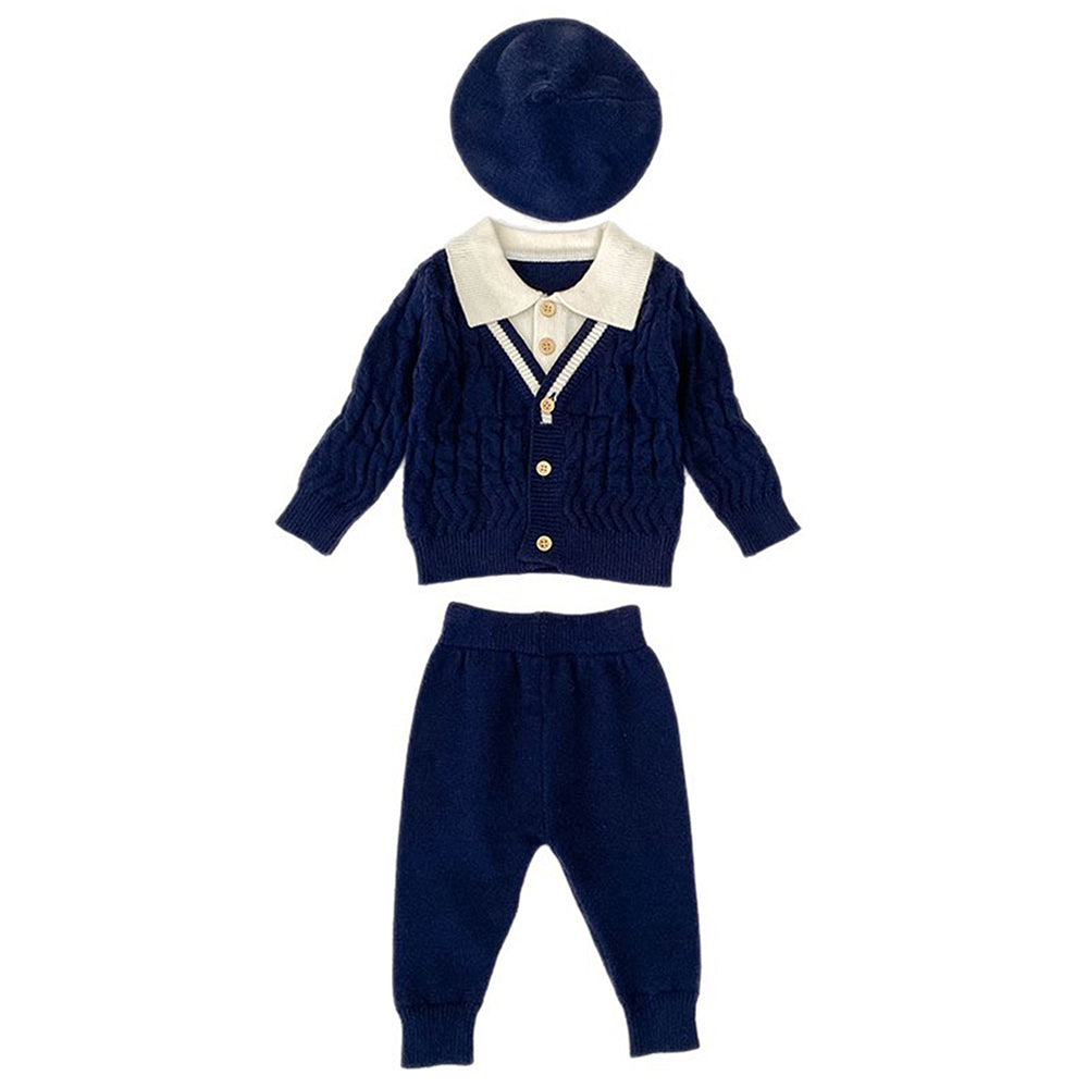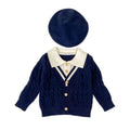 2 Pcs Navy Cream Collared Winter Knit Cardigan & Pants with Beret Cap for Infants