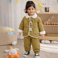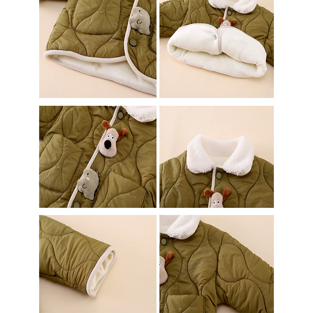 1. Design: This cozy winter 2-piece set features an olive green quilted jacket with a soft white faux-fur collar, paired with matching quilted pants with cute plush soft accents on the jacket add a playful touch, making it perfect for winter outings.