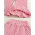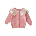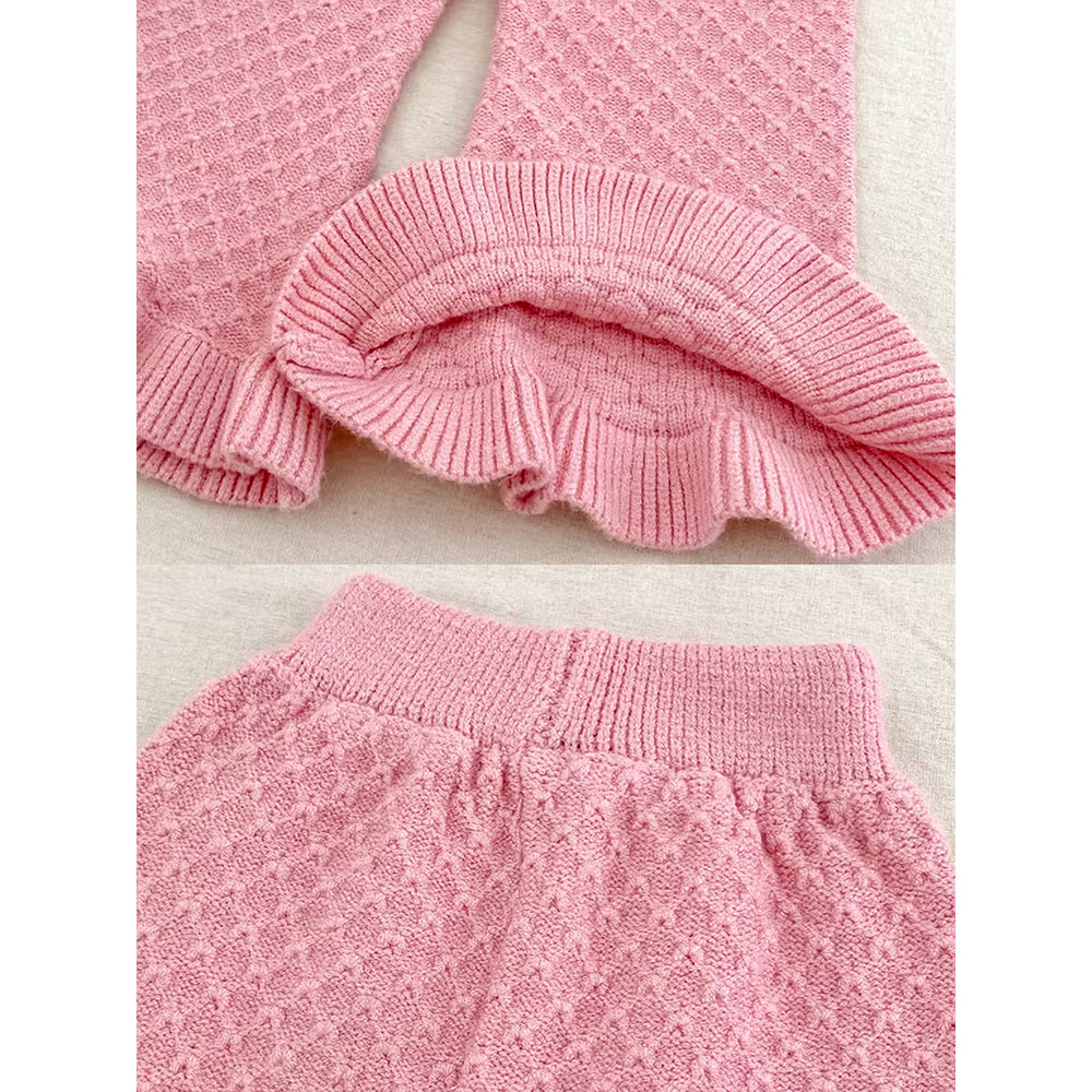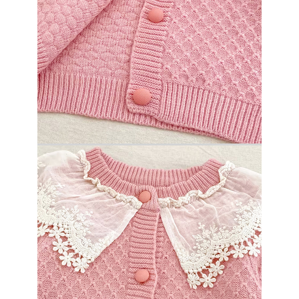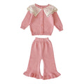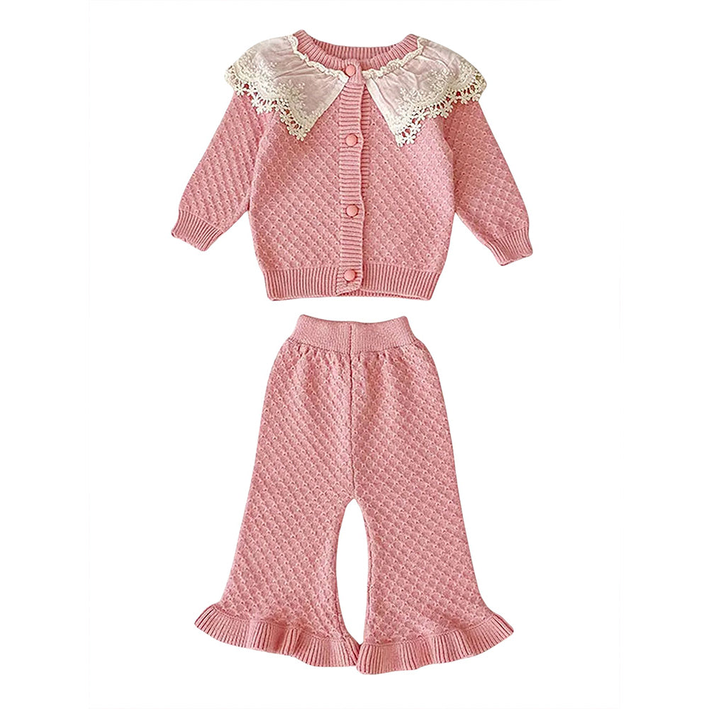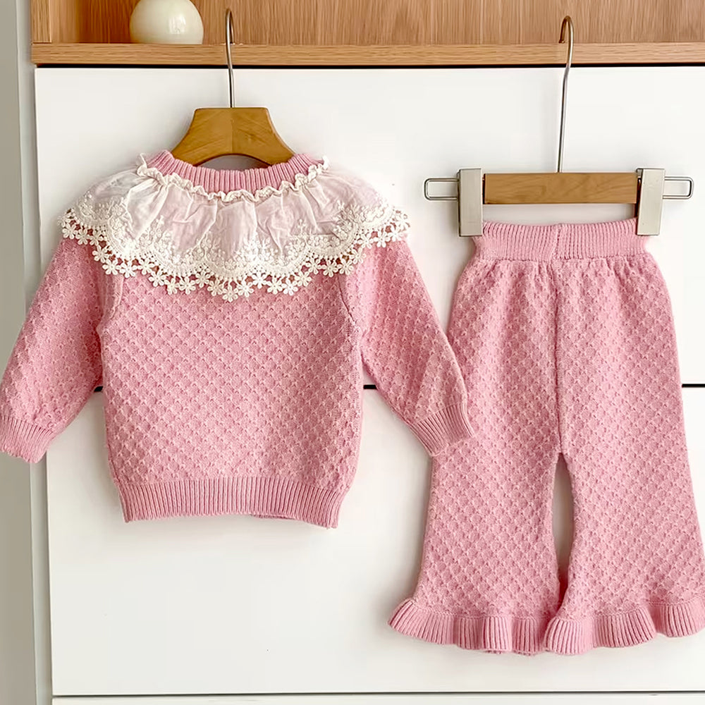 1. 2 Pcs Set: This beautiful winter set includes a peach cardigan featuring a charming sailor-style collar with delicate white lace detailing, paired with matching flare pants. The coordinated design gives your little one a stylish, bright, and cheerful winter look.
