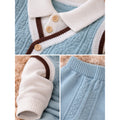 1. Design: This cute winter set includes a soft teal knitted cardigan with a cream collar, brown trim, and a vest-style design, along with matching teal pants. It also comes with a beret- style cap to complete the look. The simple and stylish design keeps your baby looking neat and adorable.