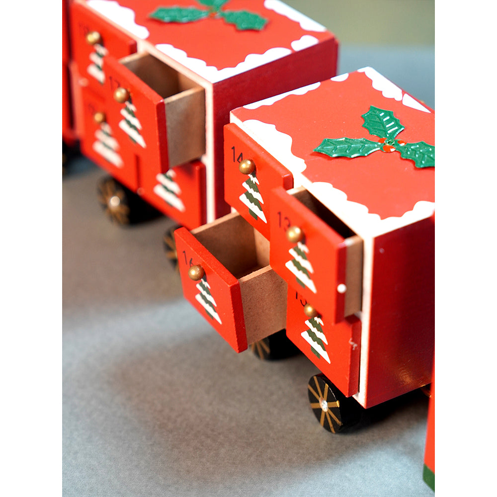 1.24-Day Advent Calendar: Make your Christmas countdown delightful with this wooden train advent calendar, beautifully designed in festive red and green tones. Featuring 24 numbered drawers, each decorated with charming Christmas trees, this piece brings a joyful touch to your holiday season.