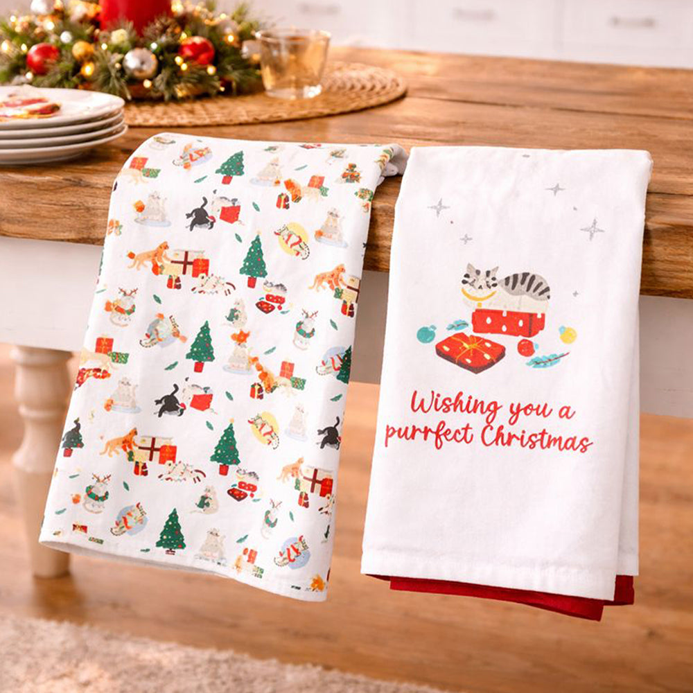 2. Christmas Designs: This set includes two napkins: one with an all-over Christmas pattern featuring trees, gifts, festive icons, and holiday elements, and another with a cute Christmas illustration of a cat sitting on a present with the text “Wishing you a purrfect Christmas.”