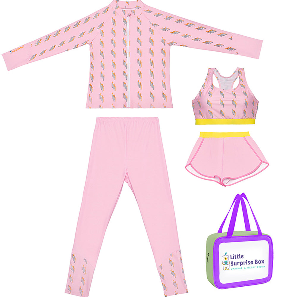 مجموعة ملابس سباحة مكونة من 3 قطع باللون الوردي من توب وبنطال ضيق وسترة متناسقة للأطفال في سن ما قبل المراهقة والمراهقين