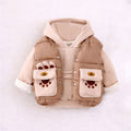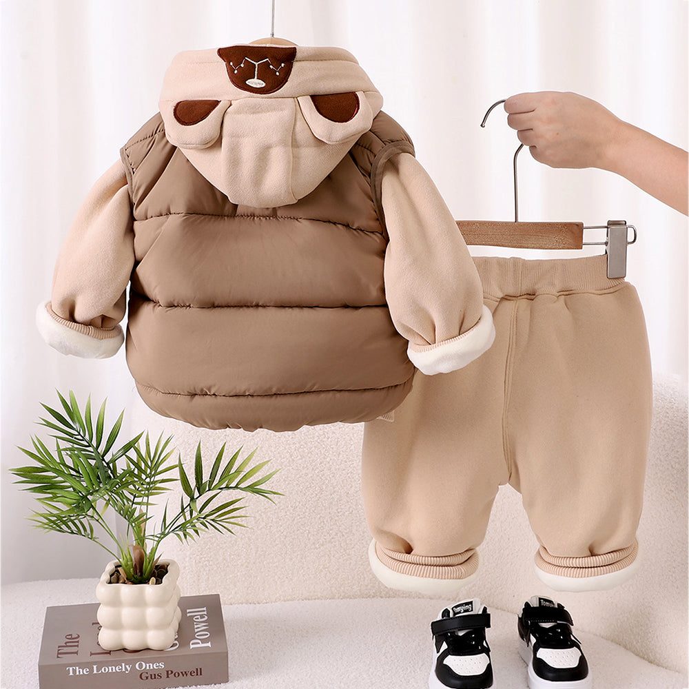 1. Smart & Stylish Design: This adorable winter set features a cozy beige puffer-style jacket with a soft hood and cute teddy face pocket detailing on the front. The jacket is layered over a beige hoodie and paired with matching beige pants. The playful teddy accents and quilted texture add a charming yet stylish winter-ready look.
