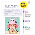 1.Design:Designed in a fun 3D Bunny print,this kids sun hat provides excellent sun protection with a wide brim to shield the face and neck.Its not a heavy hat .It is designed as a super light hat for toddlers. 2.Coverage:It provides a good coverage with a wide brim covering the face. 3.Adjustable Chin Strap:The chin strap ensures secure fit for active play and windy days.The strap also comes along with ablow shistle which makes it fun for the kids. 4.Lightweight & Quick-Dry Fabric:The quick dry fabric makes it an instant buy for all your outdoor play adventures with kids. 5.Variety:Little Surprise Box as a brand offers good choices for kids and toddlers outdoor adventure accessories comprising of caps,sunglasses,swimwear,beach bags,swim essentials and so much more. 6.Ideal for:This product is ideal for beach,pool,and outdoor adventures. 7.Age:Good for Toddlers and kids from 2- 5 years. |