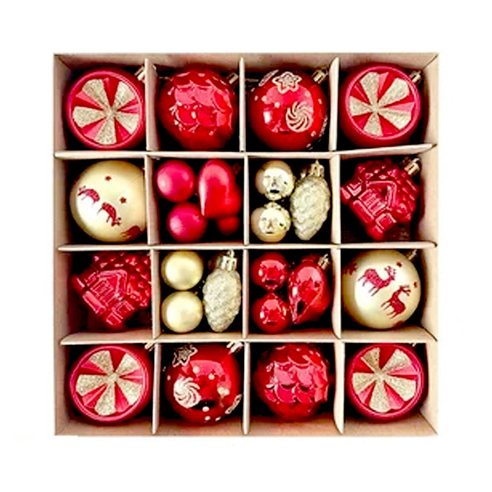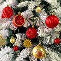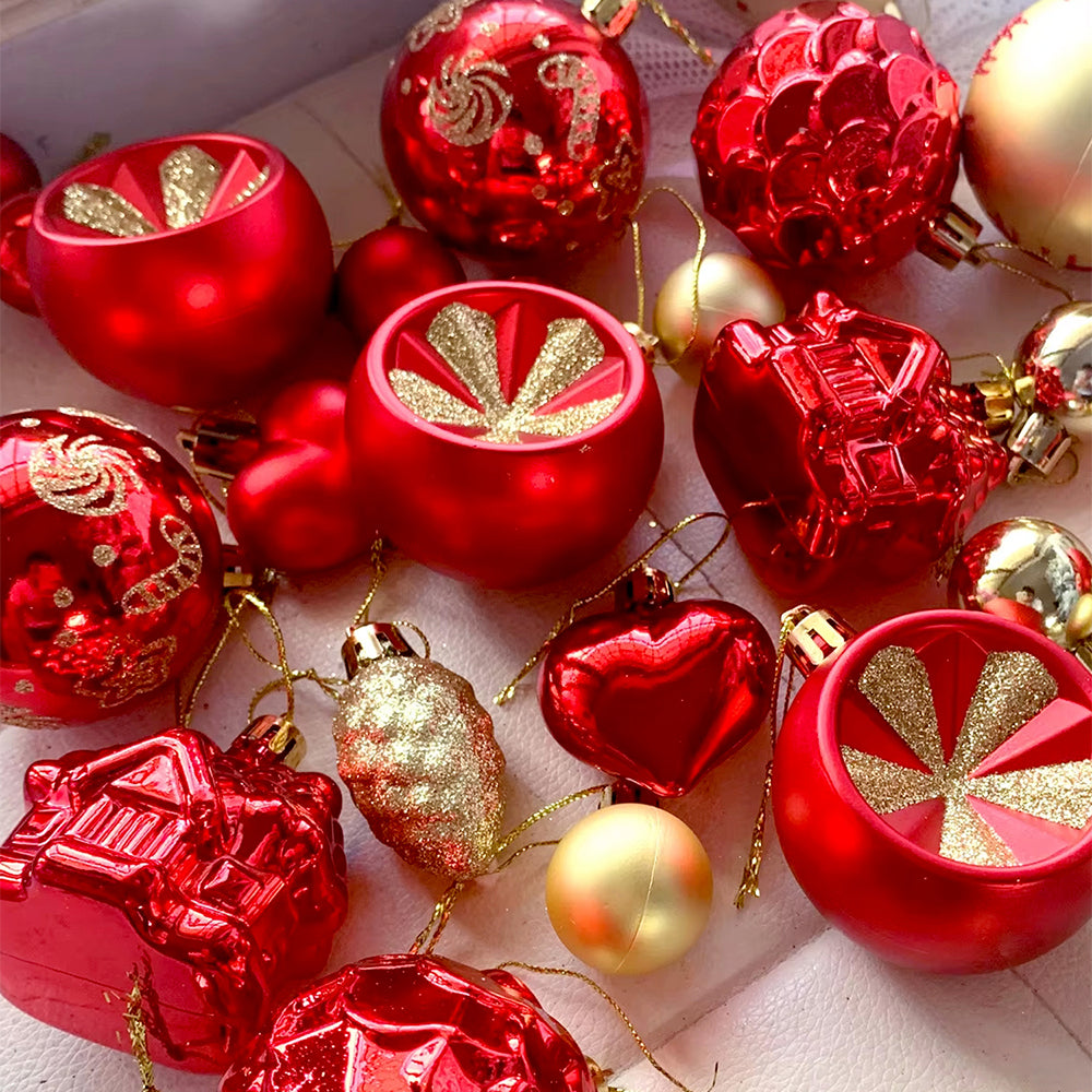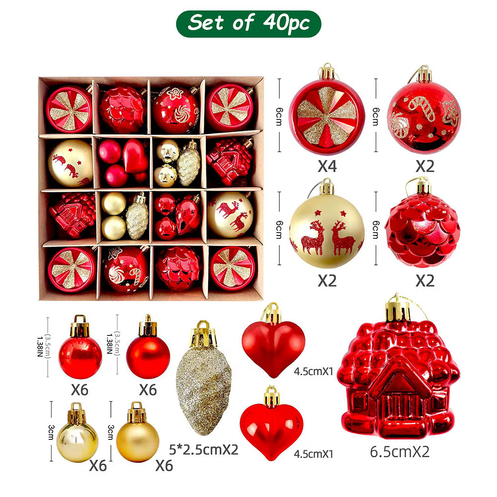 2. Red Sequins with Gold Themed Xmas Balls: This set includes 40 beautifully crafted ornaments inspired by rich Christmas elegance and sparkling festive accents. The collection features red sequin-pattern baubles, glossy balls, red hearts accents, textured pinecones, house-shaped ornaments, printed baubles and more. Each ornament is thoughtfully designed to bring a luxurious charm to your Christmas tree.