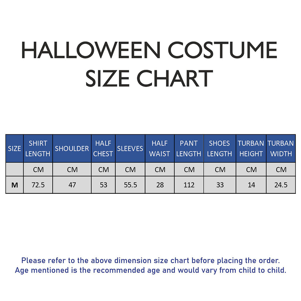 4.Accessories, 6pcs set: 1pc of attractive long satin shirt with an attached gold trimmed Coat Look, 1pc of thick broad red belt tie up with fringes, 1pc of straight fit pants, 1pair (2pcs) of curly toe style boots for a perfect aladdin boots look and 1pc of stunning typical turban style headgear therby completing the entire magical look. The entire look is perfectly designed to spark imagination. Ideal for adults who love Magical adventures and fairy tale roleplays.