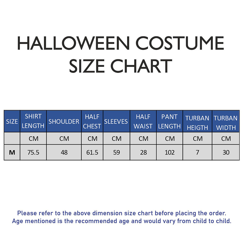 4.Accessories, 4pcs set: 1pc of attractive long satin shirt with an attached gold trimmed Coat Look, 1pc of thick broad gold shimmer belt tie up, 1pc of matching pants and 1pc of stunning typical turban style fancy headgear therby completing the entire magical look. The entire look is perfectly designed to spark imagination. Ideal for adults who love Magical adventures and fairy tale roleplays.
