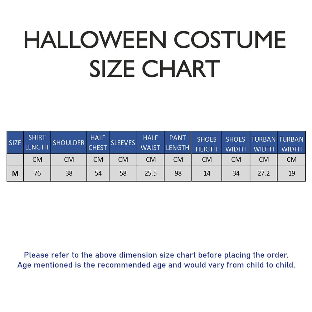 4.Accessories, 6pcs set: 1pc of attractive long satin shirt with an attached gold trimmed Coat Look, 1pc of thick broad gold shimmer belt tie up, 1pc of straight fit pants, 1pair (2pcs) of curly toe style boots for a perfect aladdin boots look and 1pc of stunning typical turban style fancy headgear therby completing the entire magical look. The entire look is perfectly designed to spark imagination. Ideal for adults who love Magical adventures and fairy tale roleplays.