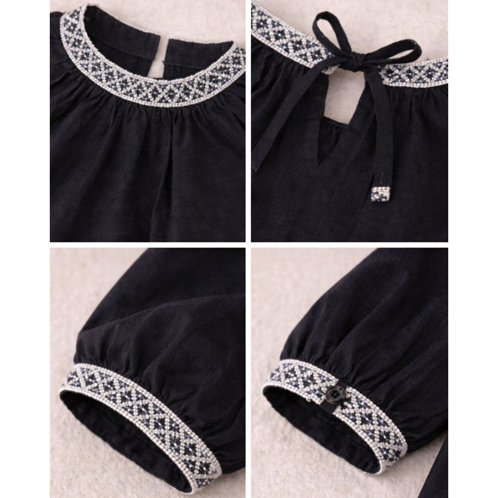 1. Design: This stylish black top features elegant white embroidery around the neckline, adding a subtle and a premium touch. The simple design makes it easy to style for both casual and dressy looks.