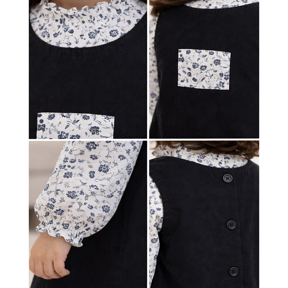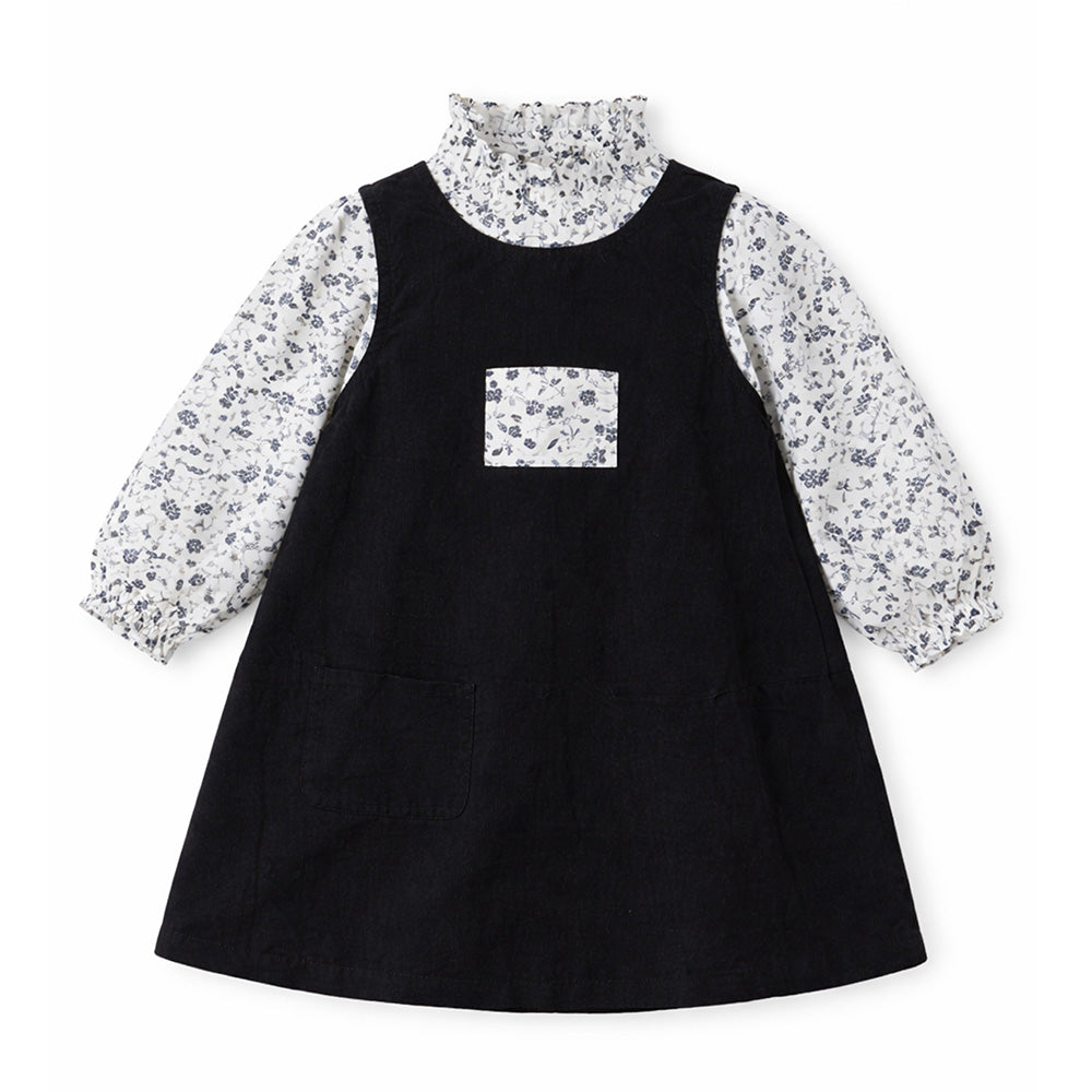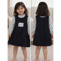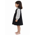 1. Design: This elegant 2-piece set features a classic black pinafore dress layered over a full-sleeve inner top with a delicate all-over floral print. The contrast of the solid black pinafore with the printed inner top creates a timeless and stylish look.