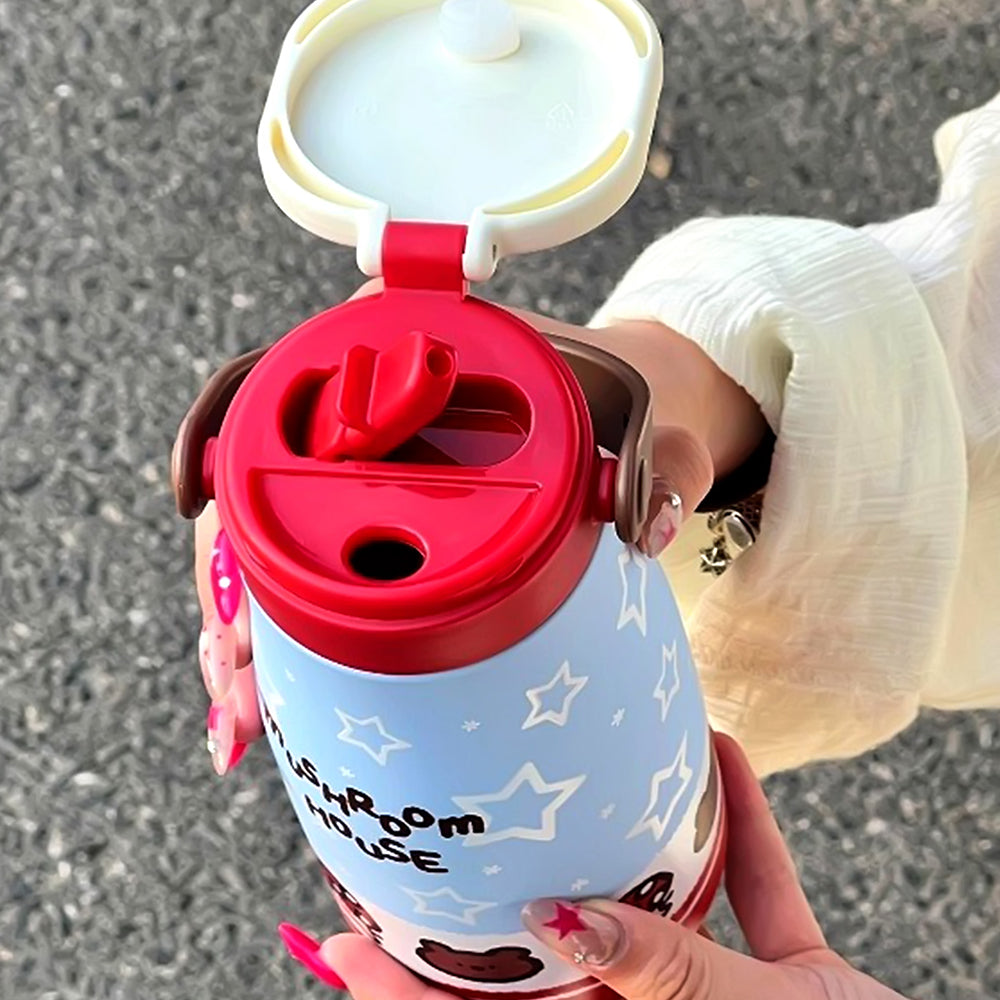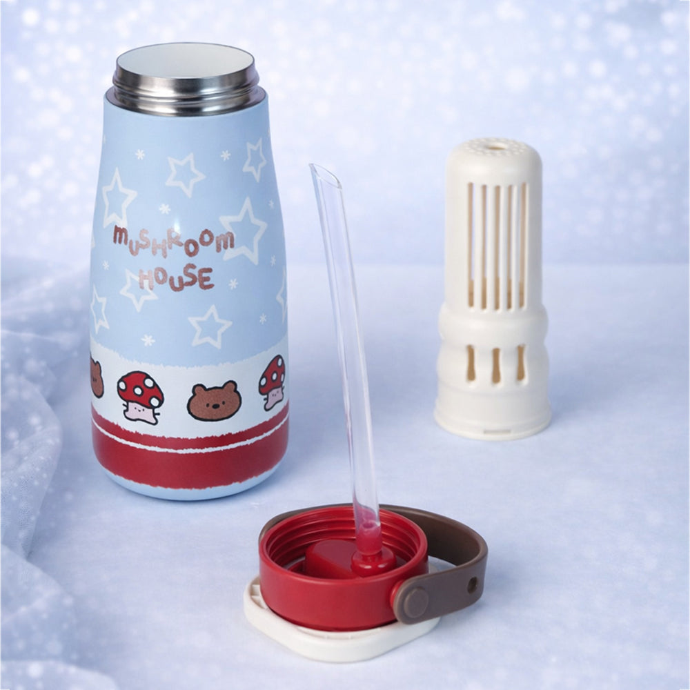 1. Insulated with Filter Thermos: An adorable pastel bottle with “Mushroom House” design, featuring cute bears, stars, and mushrooms —perfectly playful and loved by both kids and adults. Comes along with a detachable internal filter/infuser ideal for tea leaves, fruit infusions, herbs, or preventing ice and fruit pieces from coming through while drinking. Hence is useful for kids as well as adults.