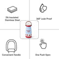 5. Leak Proof : Provides triple protection against leaks such as silicone seals and locks, children can turn the water bottle in any direction (even upside down) without it spilling.