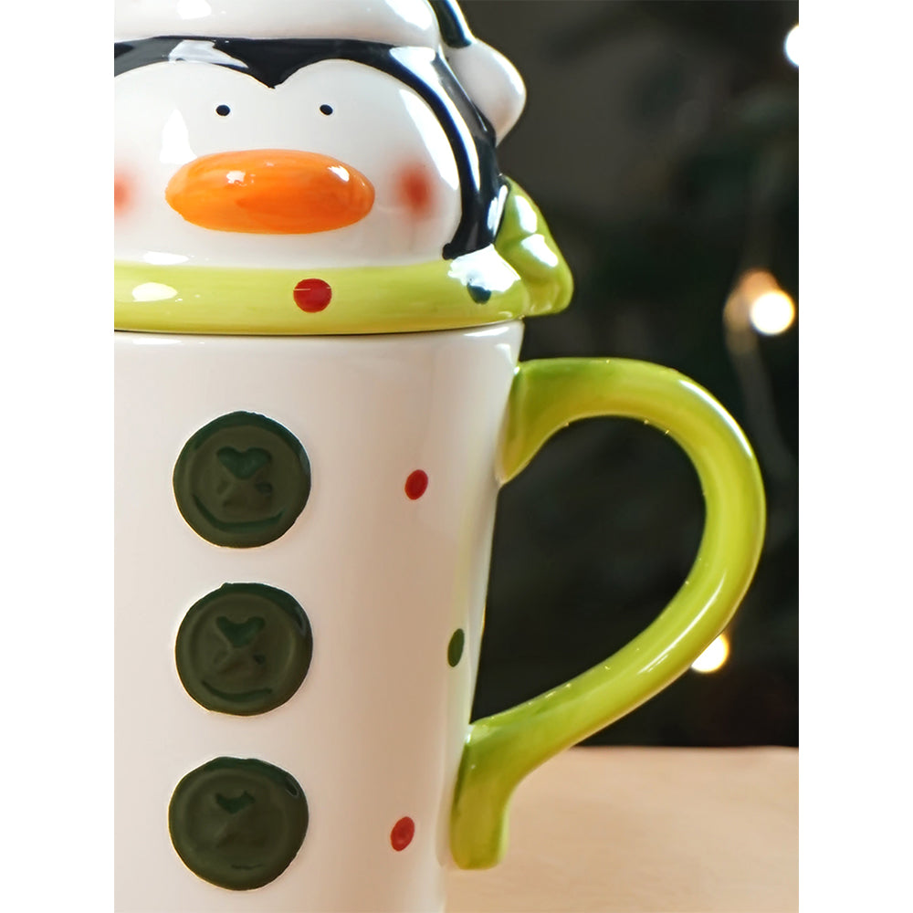 2. Design: This beautifully handcrafted ceramic mug features a clean white body with festive red and green dot detailing inspired by cozy winter outfits. The soft green handle adds a gentle pop of colour. The highlight of the mug is its 3D Penguin Ceramic Lid, sculpted with a bright orange beak and a cosy winter cap.