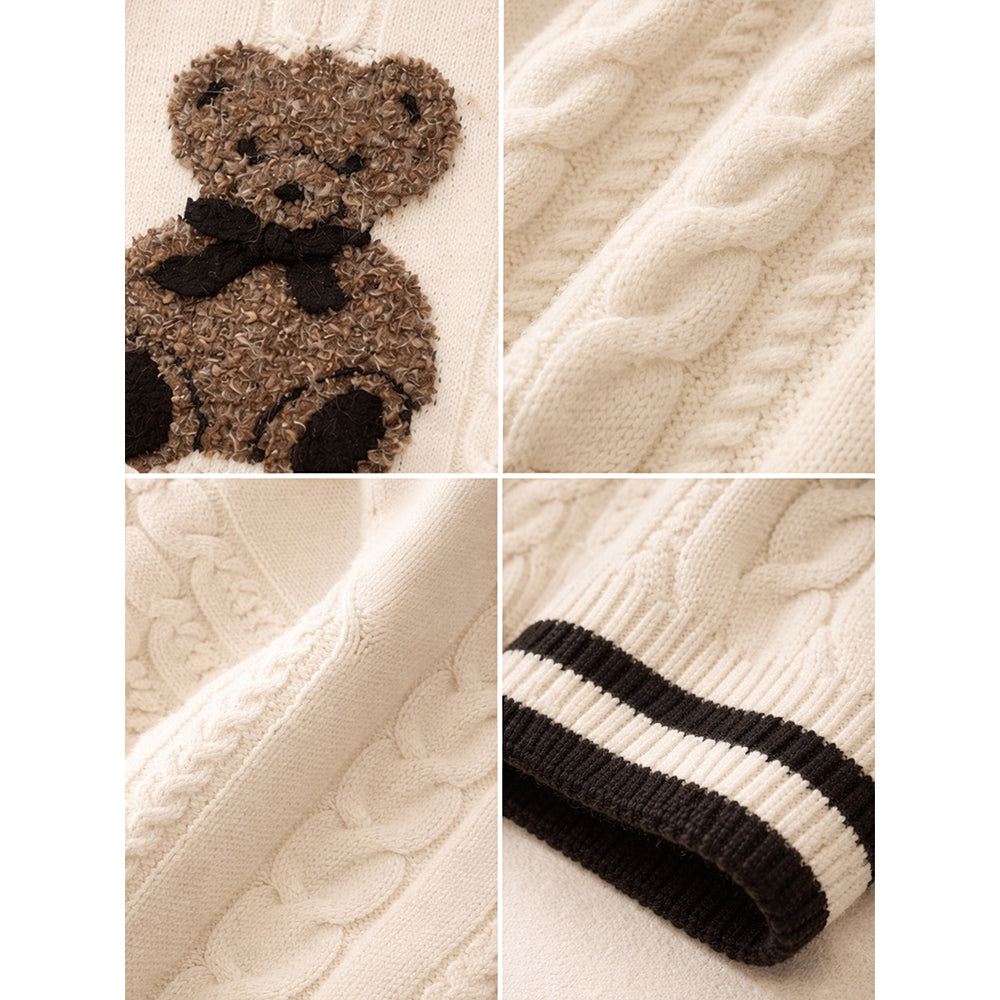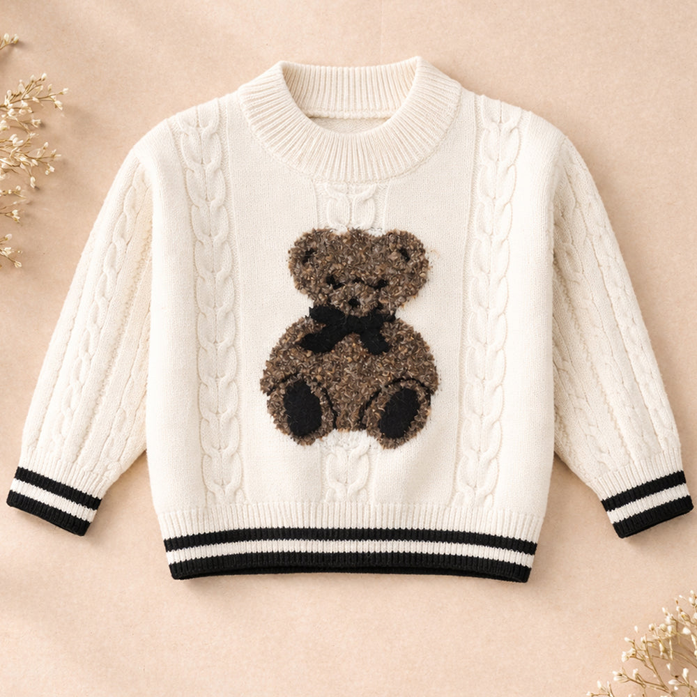 1. Design: This cute winter sweater is perfect for little ones who love a warm, cosy, and adorable look. The soft cream pullover features a brown teddy patch in the centre paired with a classic cable-knit pattern on the front and sleeves. The design gives a premium, sweet, and winter-ready charm your child will absolutely love.