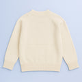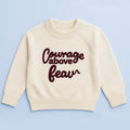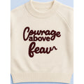1. Design: This beautifully crafted winter sweater is designed to keep your little one warm while inspiring confidence and positivity. This cream coloured pullover features a bold, textured embroidered message “Courage Above Fear”, adding a stylish and meaningful touch.