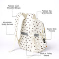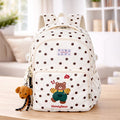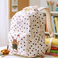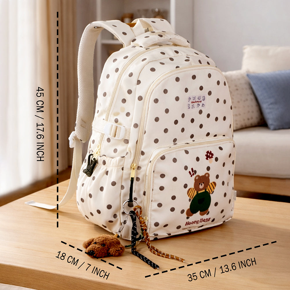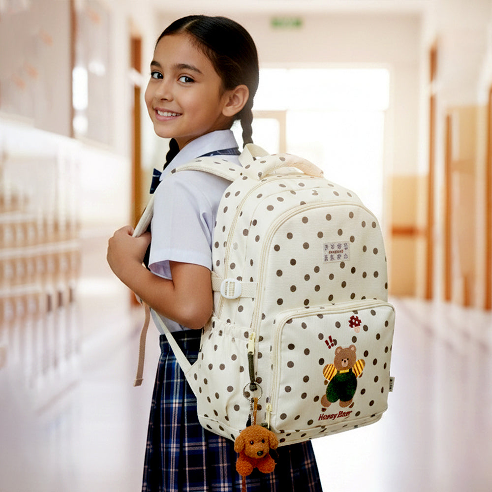 Cream Polka Dot Honey Bear Print School Backpack with Detachable Plush Dog Keychain for Kids