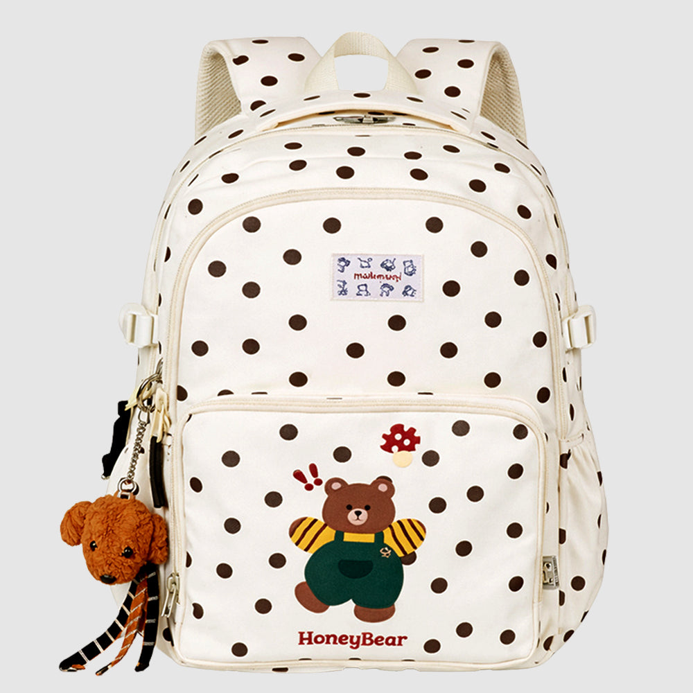 1. Honey Bear Print Backpack with Keychain: This adorable school backpack features a cute Honey Bear character print on a soft cream base with brown polka dots. It comes with a detachable plush dog keychain, adding a fun and playful element that kids will absolutely love.