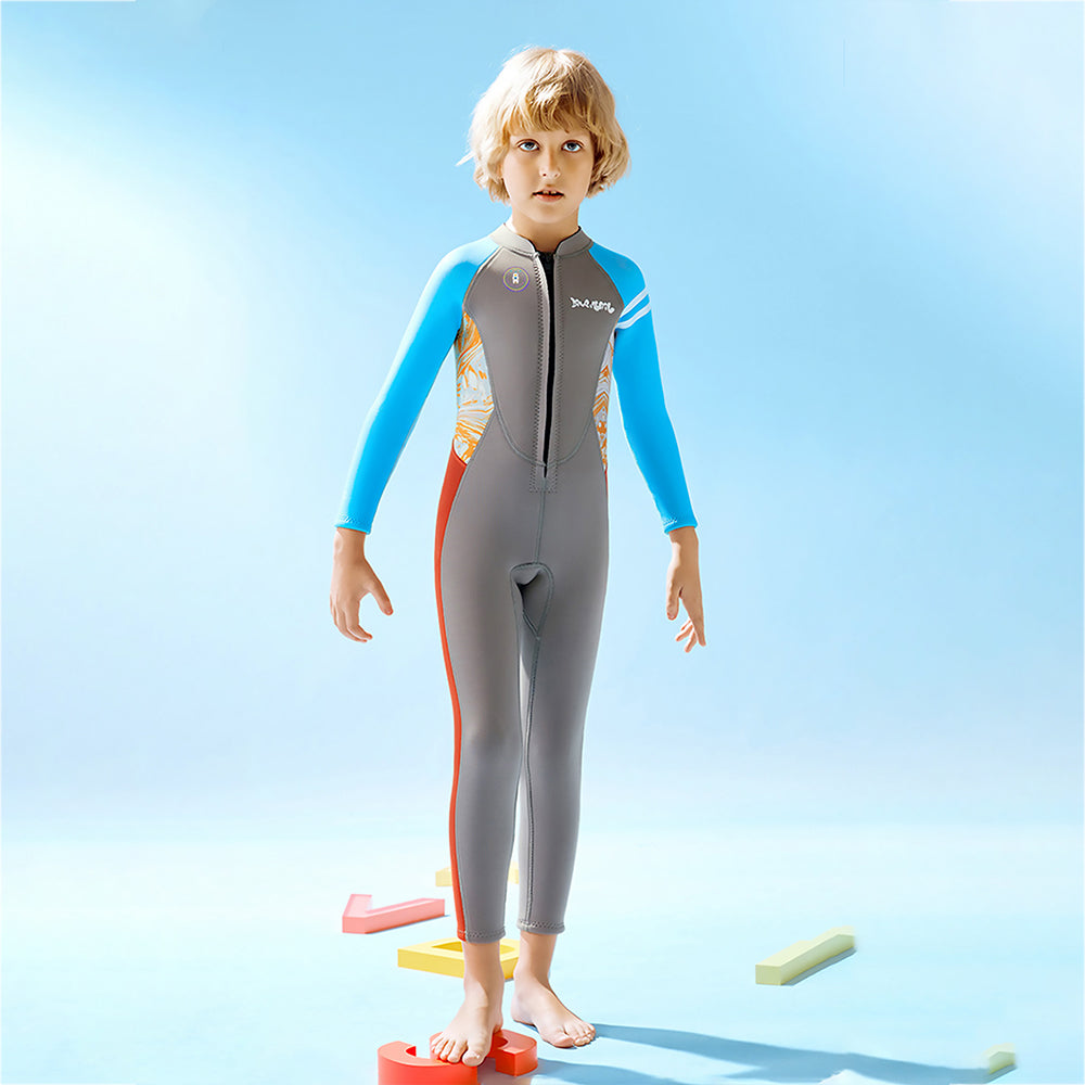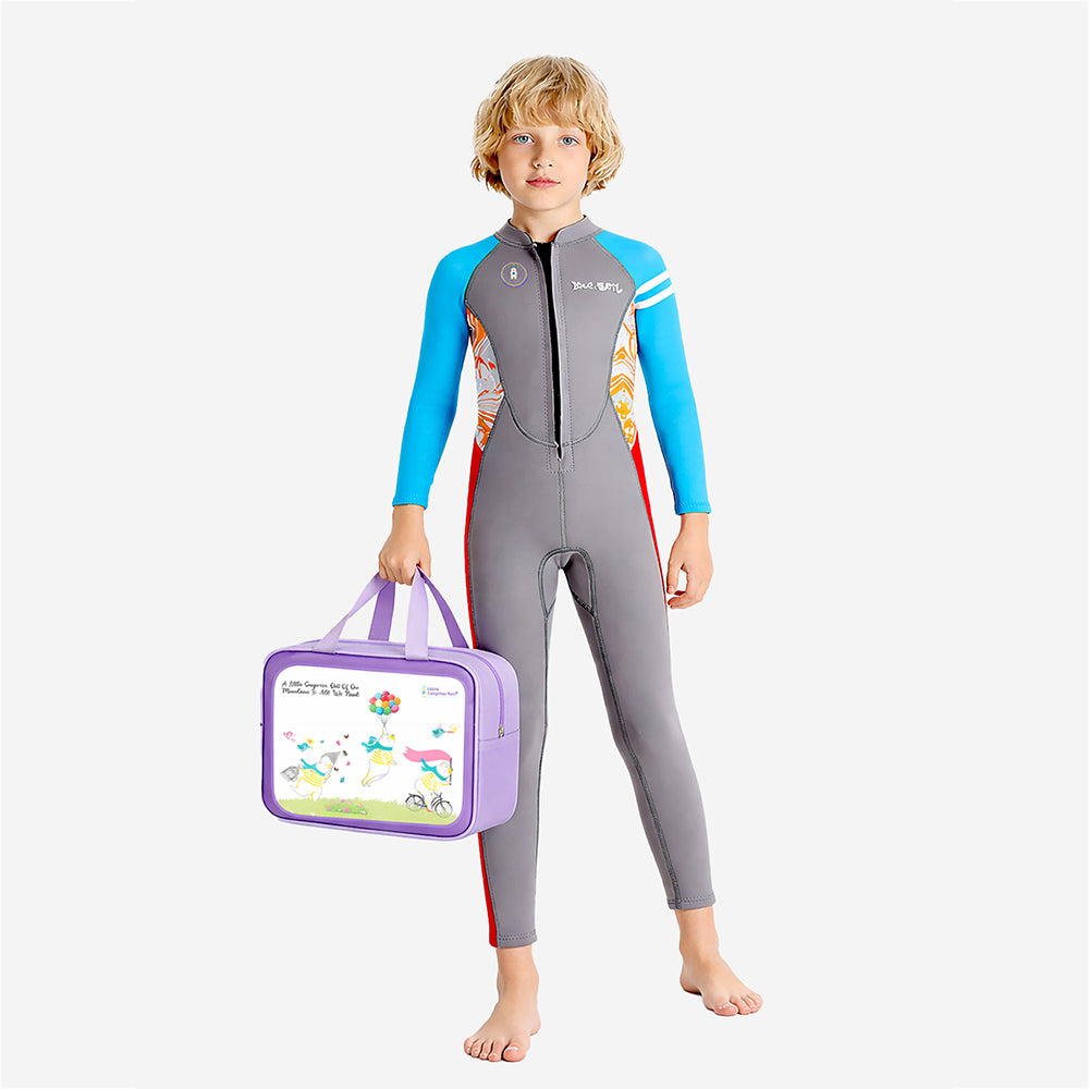 Dive Grey, Blue & Red, Full Length 2.5 mm Neoprene Kids Swimsuit with Free Washbag