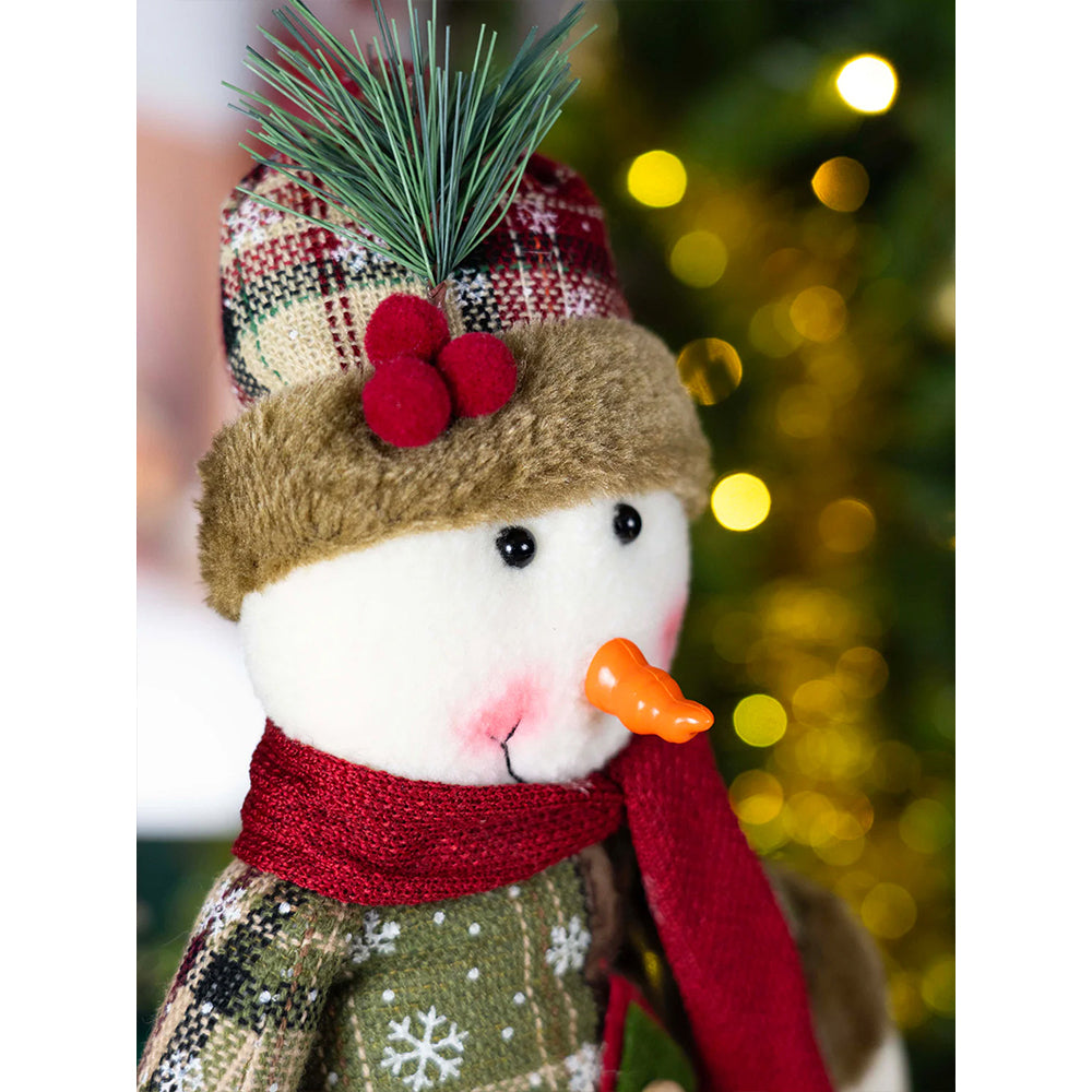 3. Detailing: Designed with rich festive textures, soft plush fabric, and detailed stitching, this snowman features premium textured cardigan style clothingwith attractive accents. His oversized plush feet and rounded face enhance his cute and mischievous Christmas character.