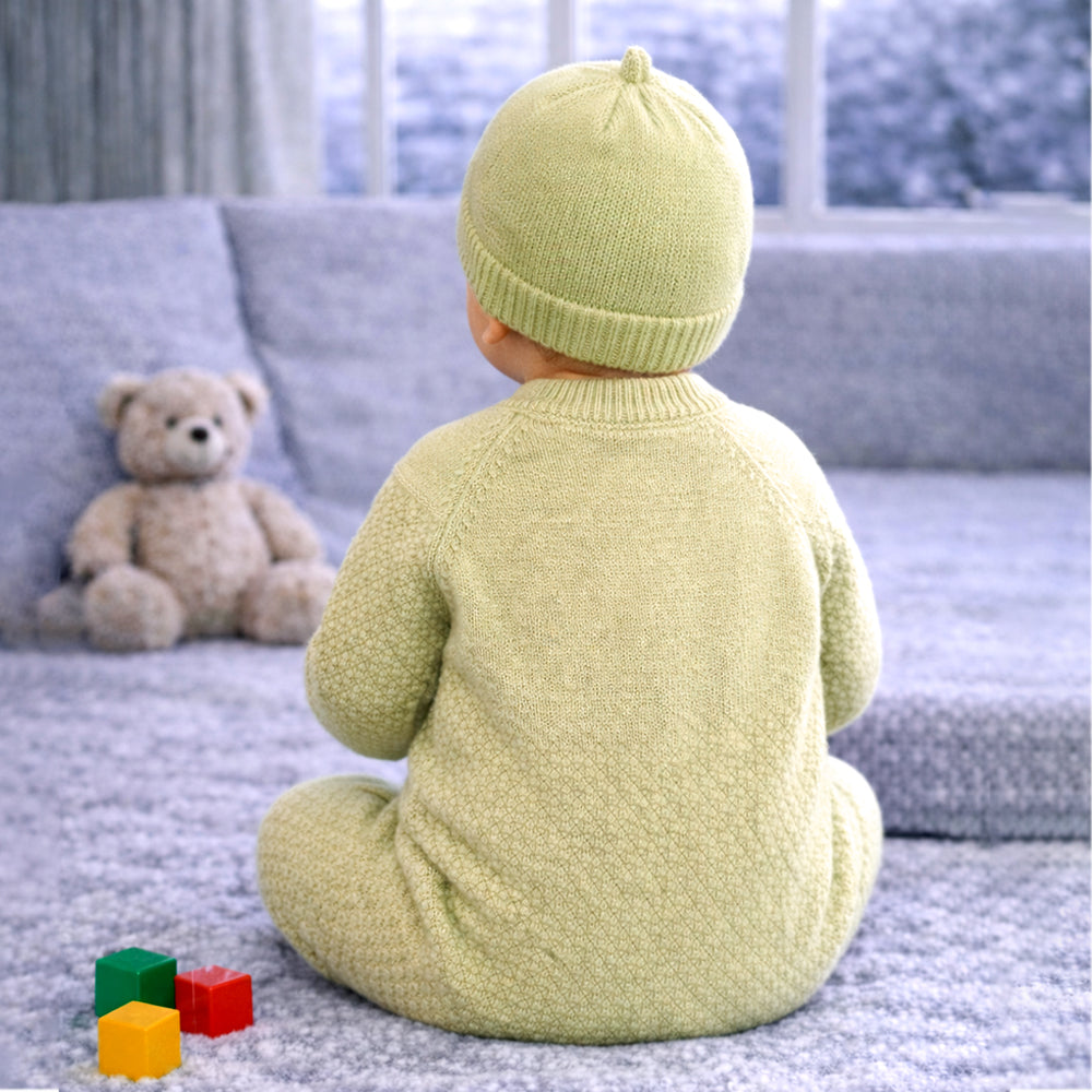 1. Adorable Diamond Teddy Design with Cap: Dress your little one in this charming green romper featuring a beautifully crafted diamond teddy patch that adds sparkle and cuteness to the outfit. The matching beret-style cap adds extra charm, giving your baby a warm, elegant, and picture-perfect winter look.