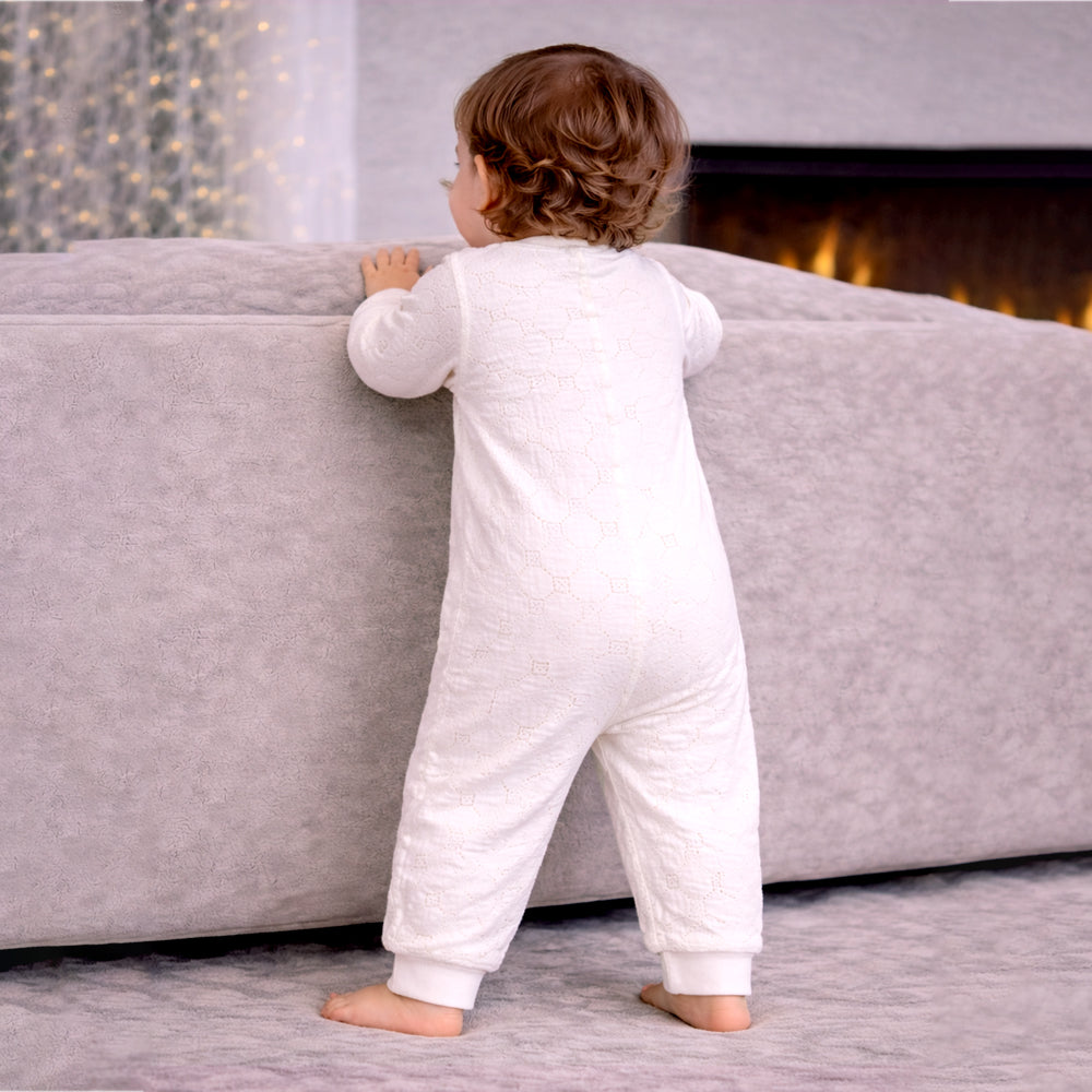 3. Convenient Snap Closure: Includes snap buttons for easy dressing and quick diaper changes. This cozy romper is an ideal choice for parents looking for comfort, convenience, and style. 4.Full-Length Sleeves and Pants: Keeps your baby warm and cozy, making it ideal for all seasons as well as cooler weather.