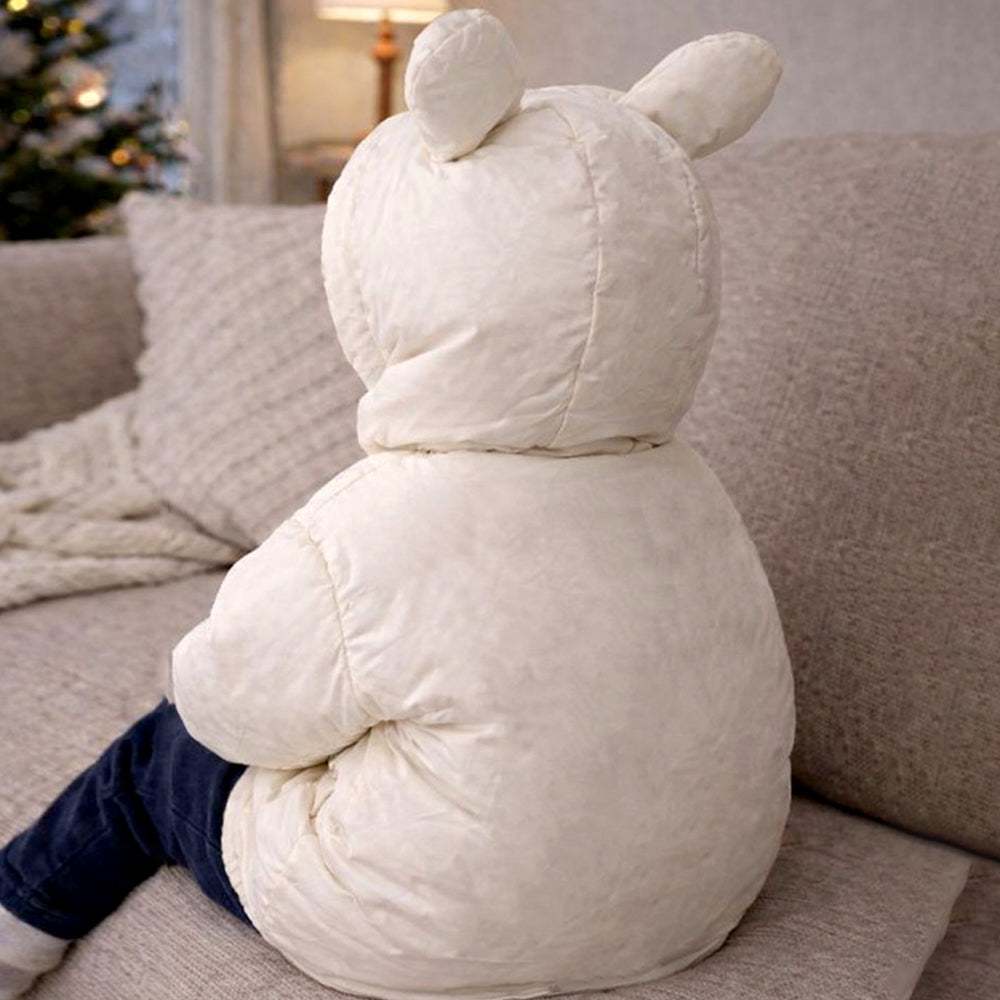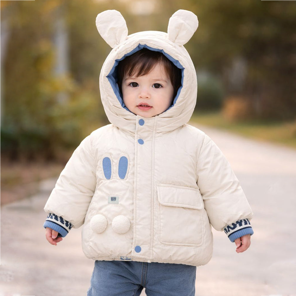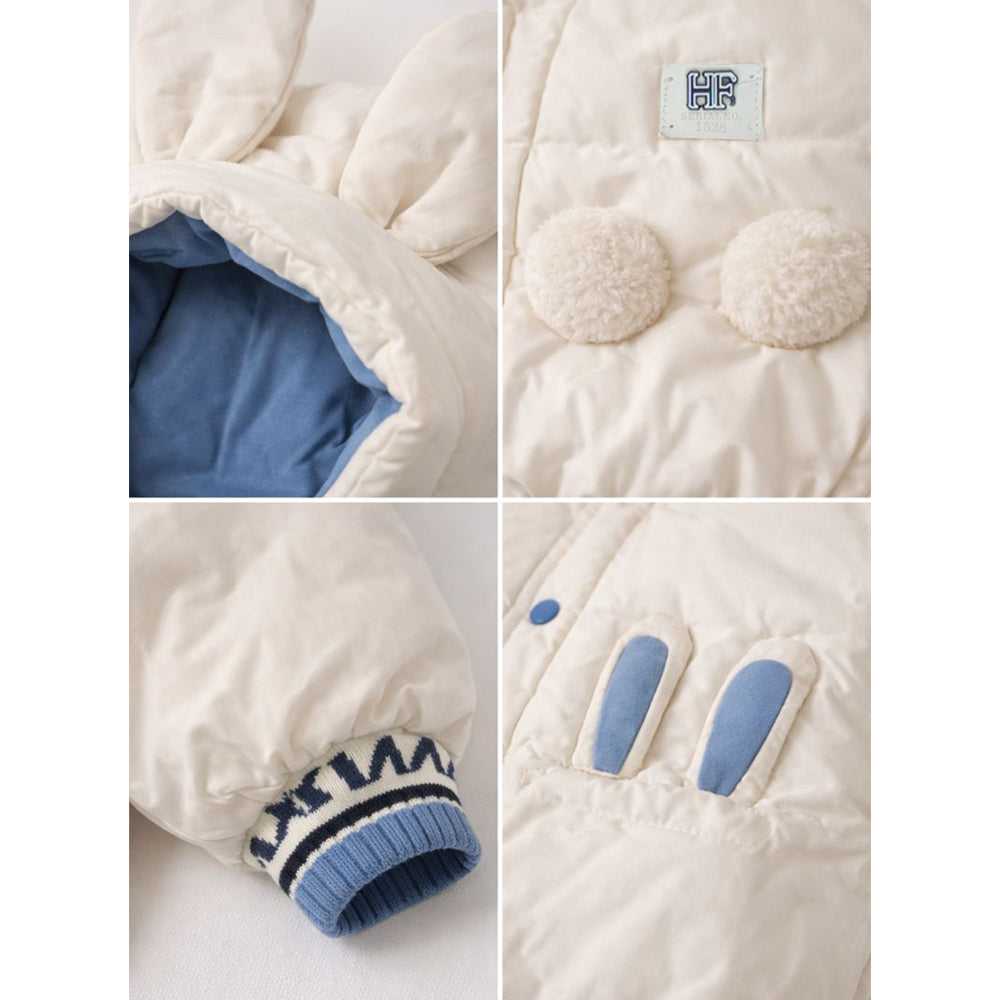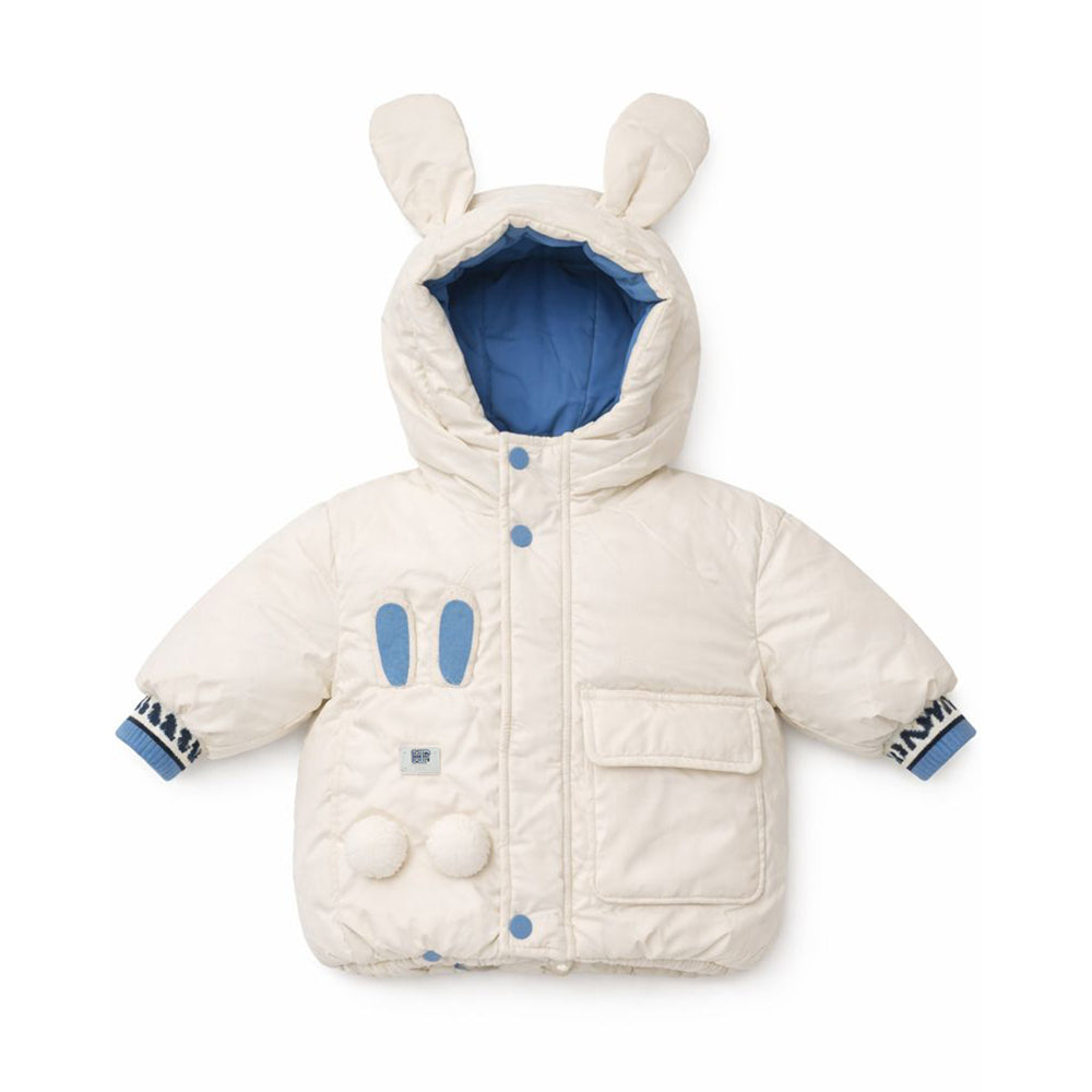 1.Adorable Bunny-Themed Hood Design: This cosy ivory winter jacket features playful 3D bunny ear detailing on the hood and cute padded bunny paw appliqués on the front pocket area. The soft ivory base paired with pops of blue creates a sweet, charming, and picture-perfect winter look for your little one.