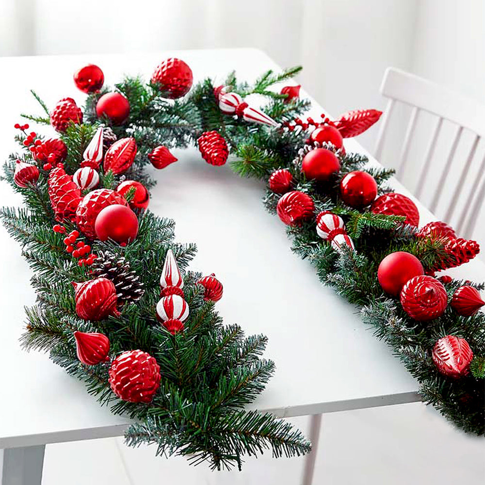 1. Bushy Filled-Up 6.5 Feet Garland: This beautiful bushy garland comes heavily decorated with striking red Big , Large size baubles, textured ornaments, pinecones, berries, candy-swirl drops, and glossy festive accents. The deep green foliage combined with bright red detailing creates a bold, luxurious Christmas statement, perfect for modern, classic, or festive styling.