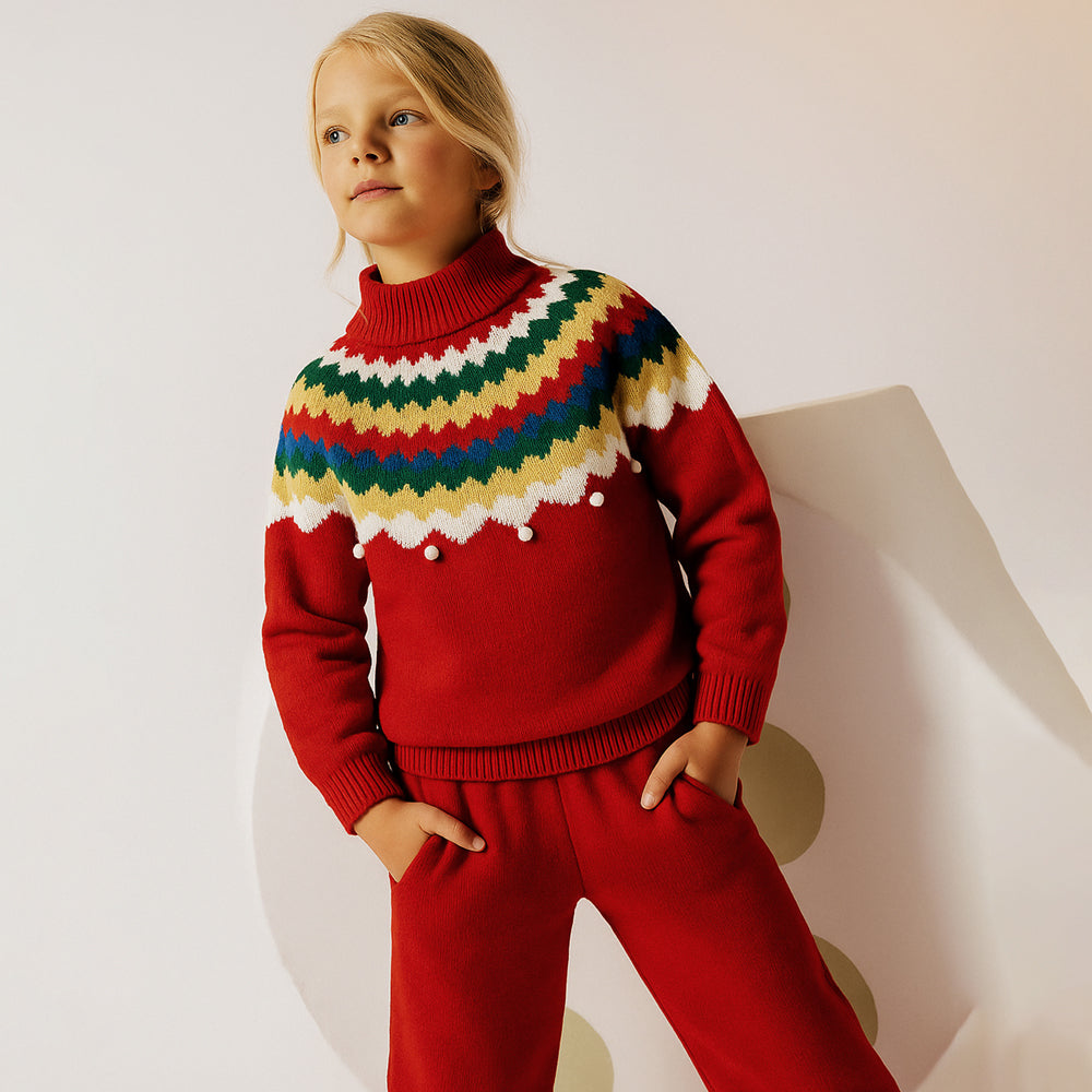 سترة دافئة من الصوف والصوف الكريسماسي متعدد الألوان من مارون مع كرات صوفية للأطفال الصغار والأطفال