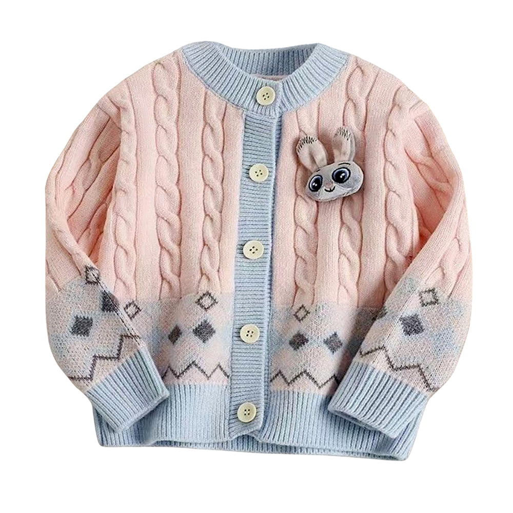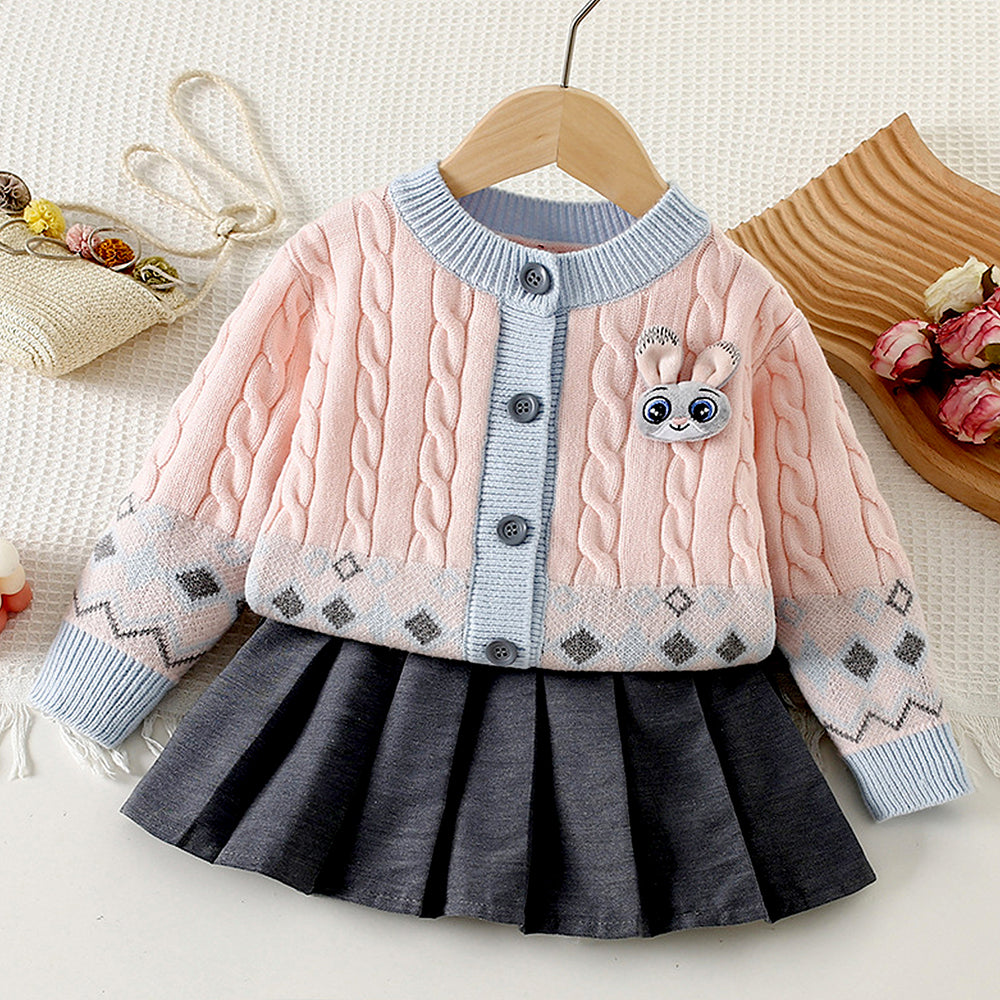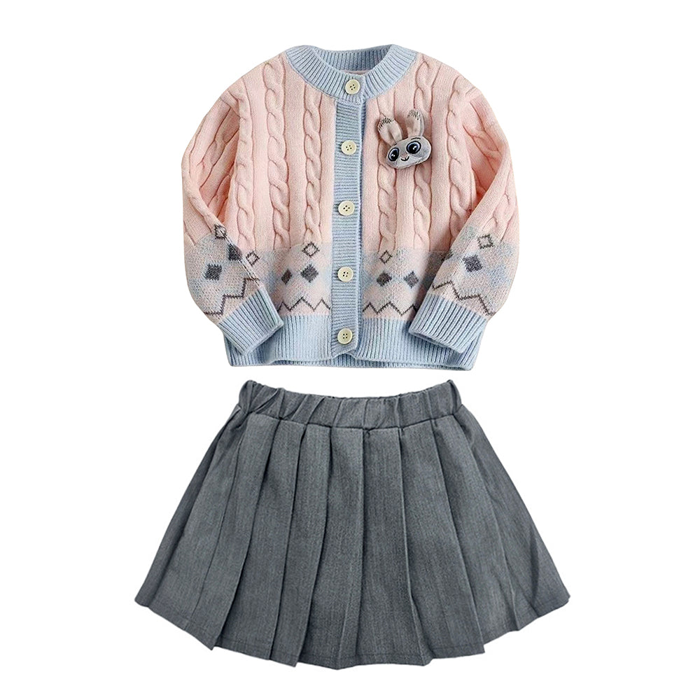 Pink-Blue Cardigan and Grey Pleated Skirt Winterwear 2Pcs set for Girls