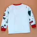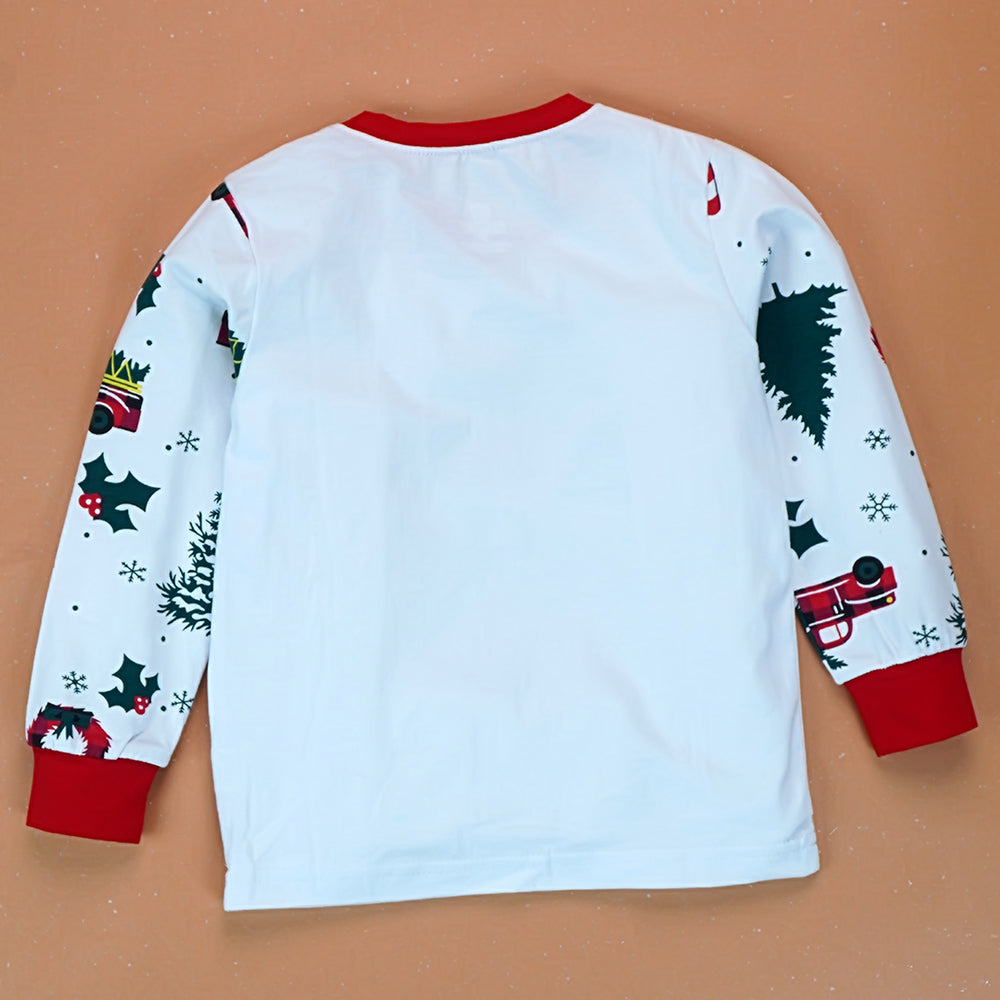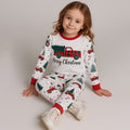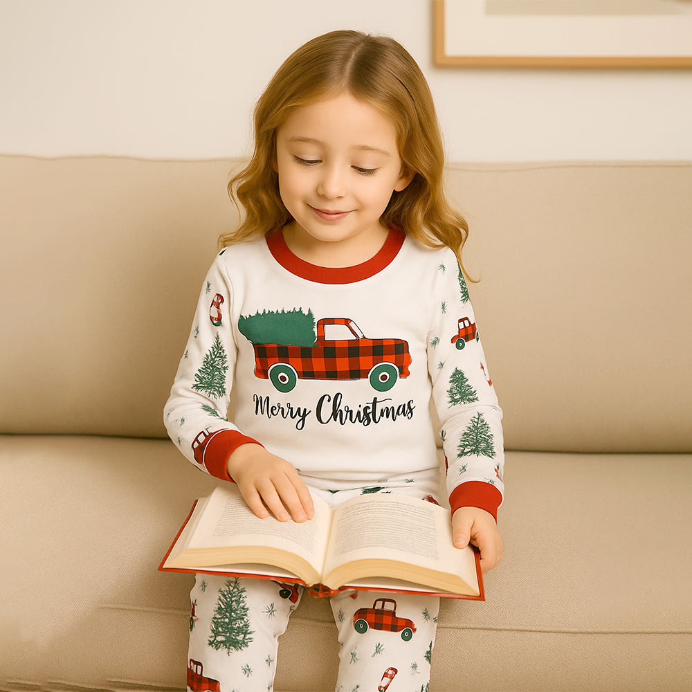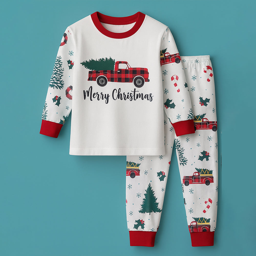 2. Festive Print: The top features a charming Christmas truck carrying a tree with a stylish “Merry Christmas” message. The sleeves and matching pants include prints of trucks, trees, wreaths, snowflakes, and candy canes, creating a cheerful and nostalgic holiday look.