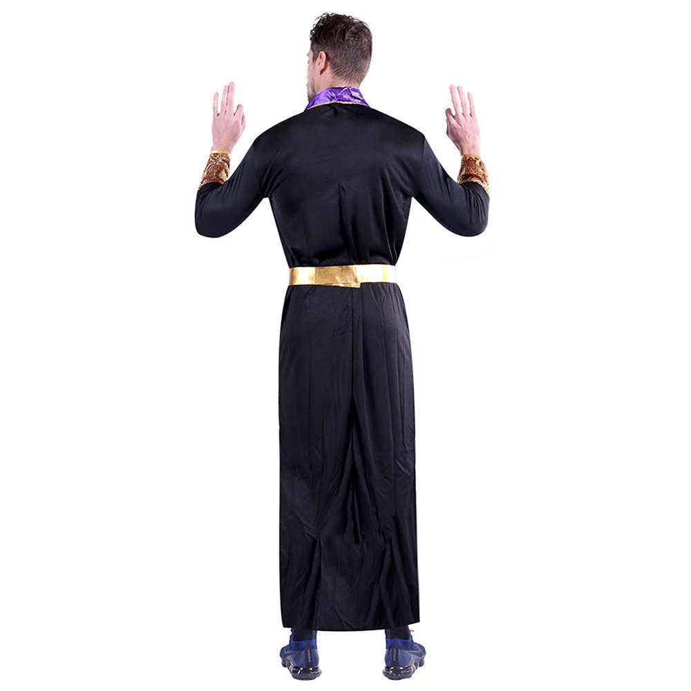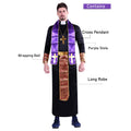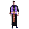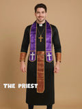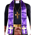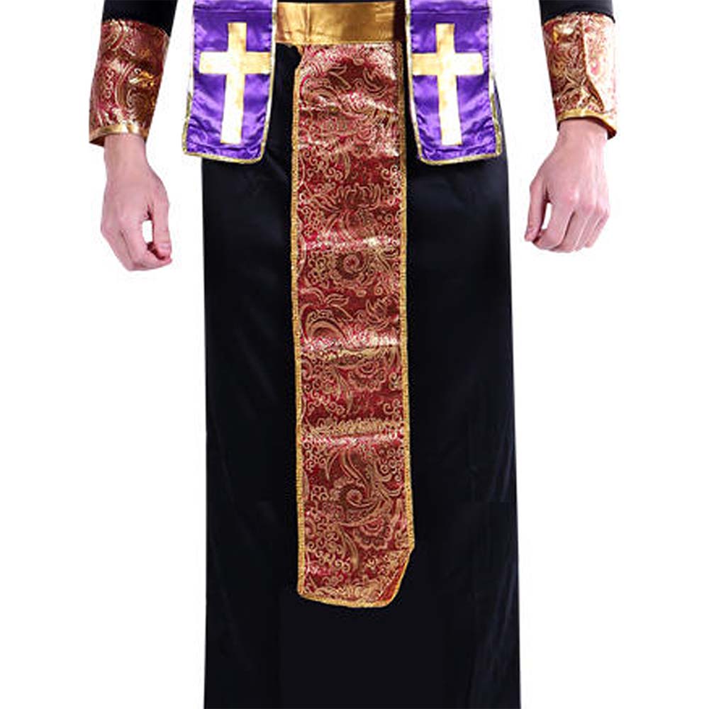 4.Accessories, 4pcs set: 1pc of black long robe with gold and maroon border detailing , 1pc of wrapping belt with a long panel flap at the centre with gold and maroon border detailing, 1 pc satin purple stole with cross print, and 1 gold felt cross pendant giving a perfectly curated realistic look of the priest. The entire look is perfectly designed to spark imagination. Ideal for adults who love spooky and horror roleplays.