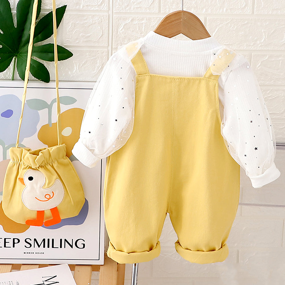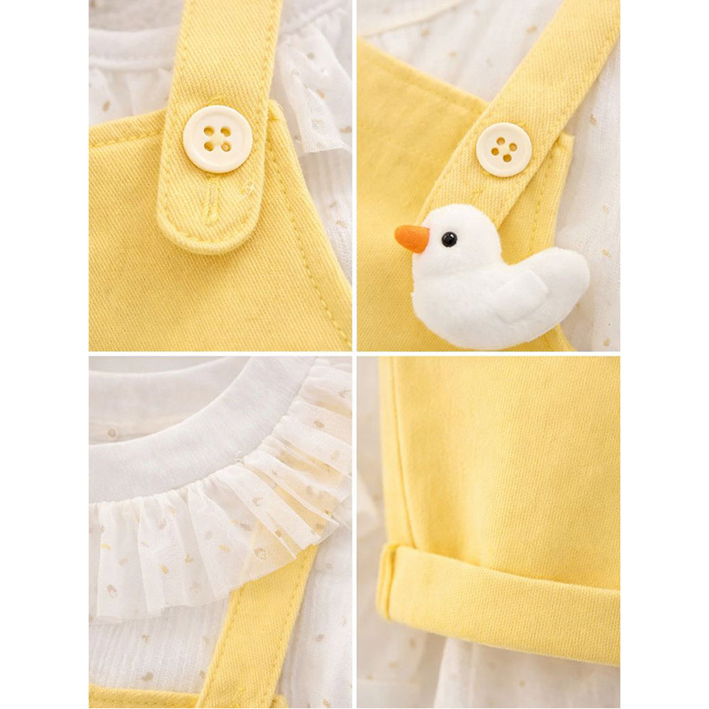Yellow Duck Dungaree with White Frill T-shirt, 2 Pcs Clothing Set For Toddlers And Kids