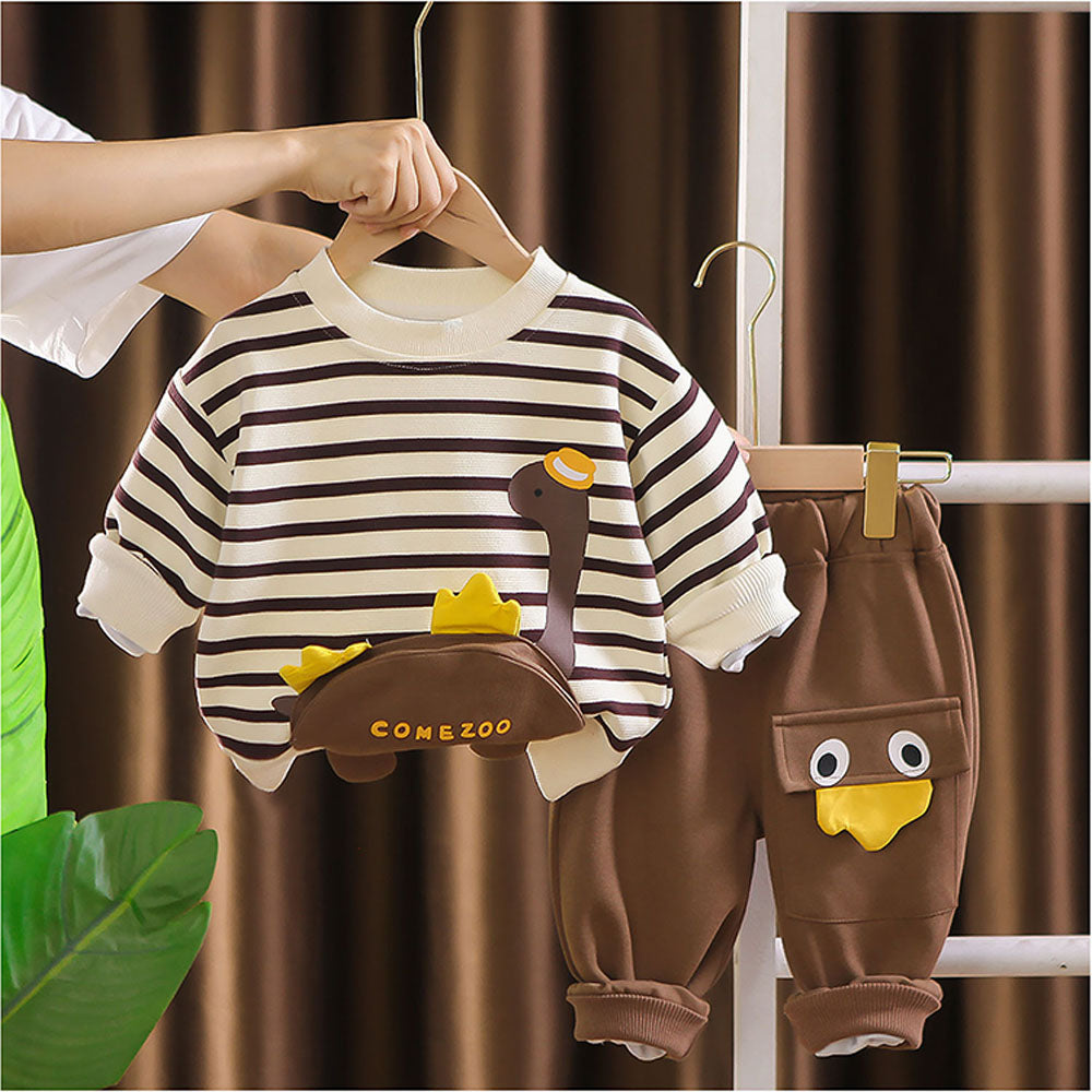 2 Pcs Set Brown Striped 3D Fluffy Dino Tummy Sweat Shirt And Pants Set For Toddler And Kids Winter And All Season Wear