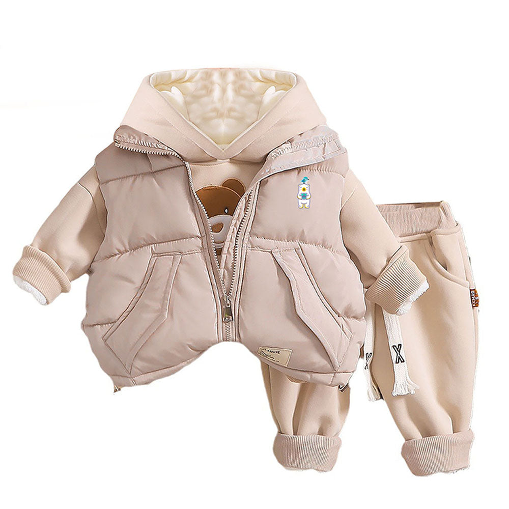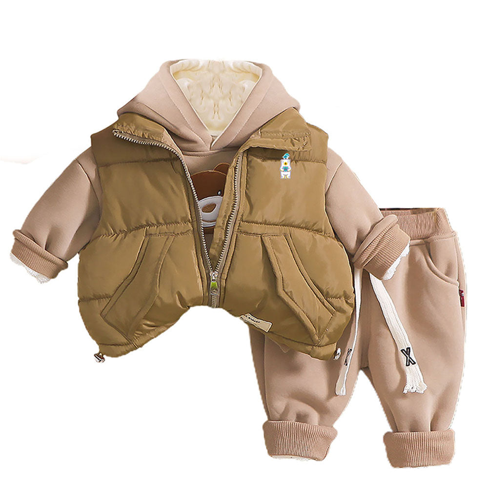 Light Brown Puffer Jacket And Matching Track Suit 3 Pcs Winterwear Set For Toddlers And Kids