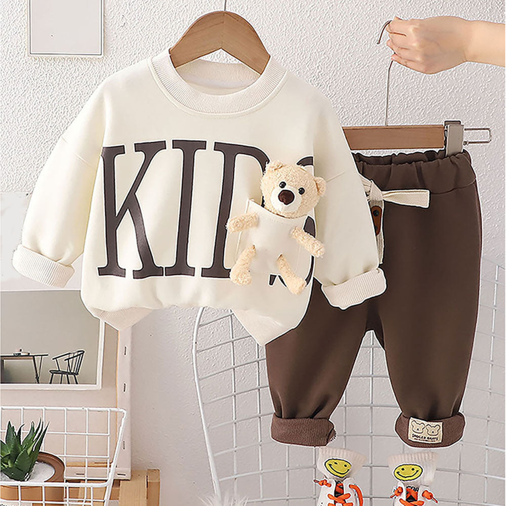Cream & Brown Kids Teddy Soft Toy 2 Pcs Track Suit Set For Toddlers And Kids