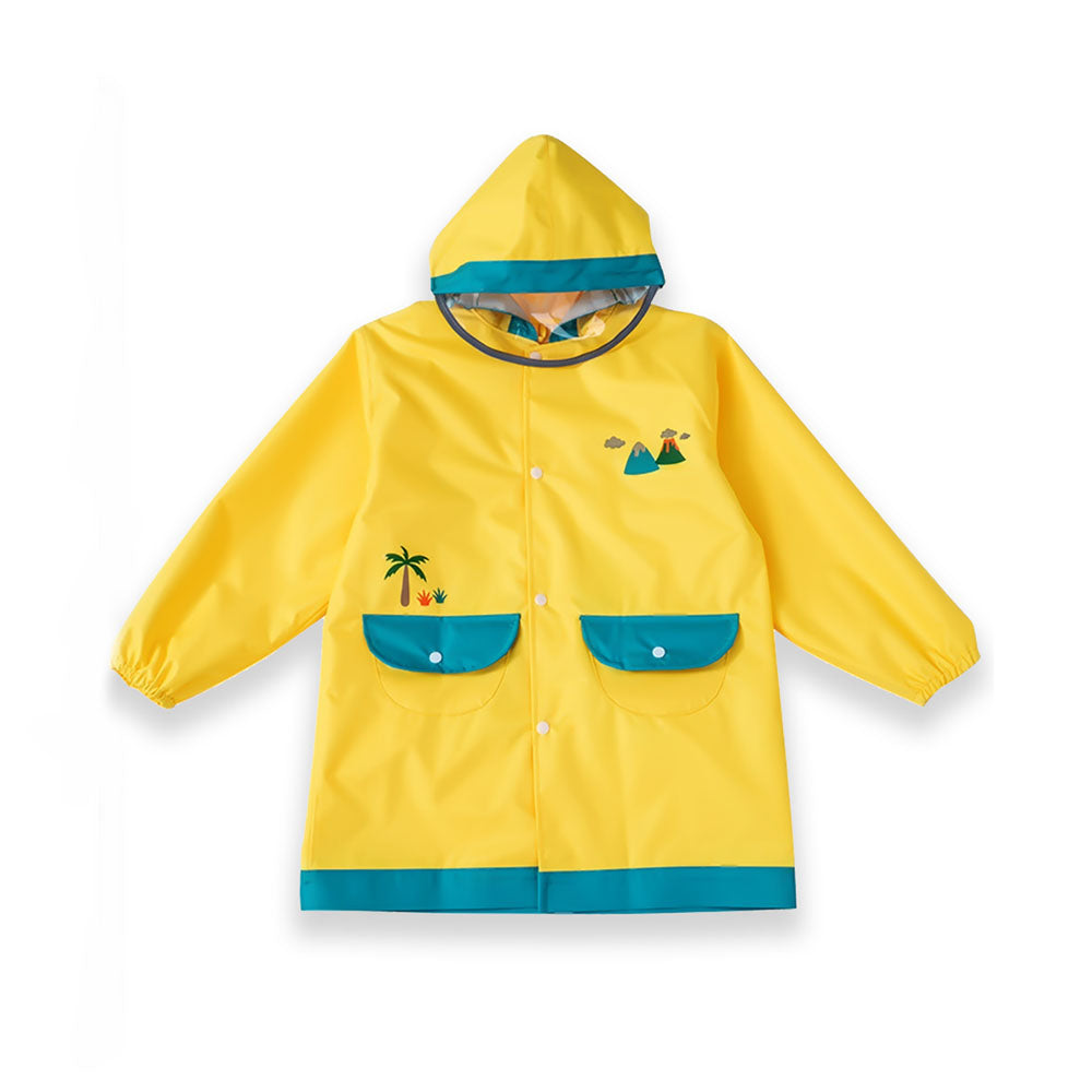 1. Design: A minimal yet attractive dual tri colored raincoat with a big playful Dino...