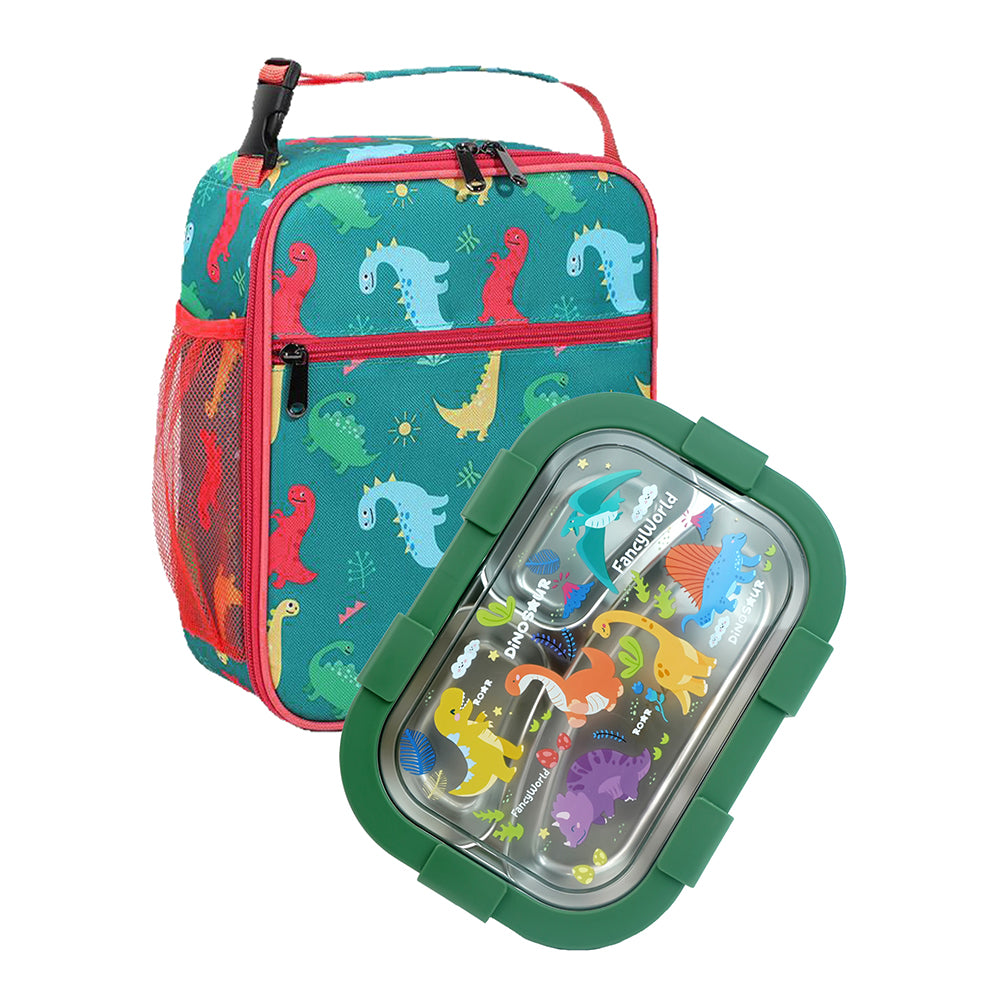 2 pcs Dino LunchBag & Stainless Steel 3 section Lunch box for Kids