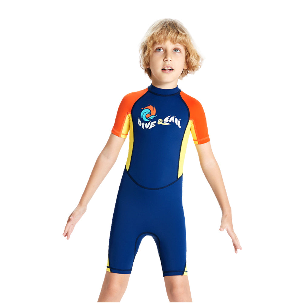 Knee Length Dive Navy & Orange Printed Kids Swimwear In Upf 50+ Fabric