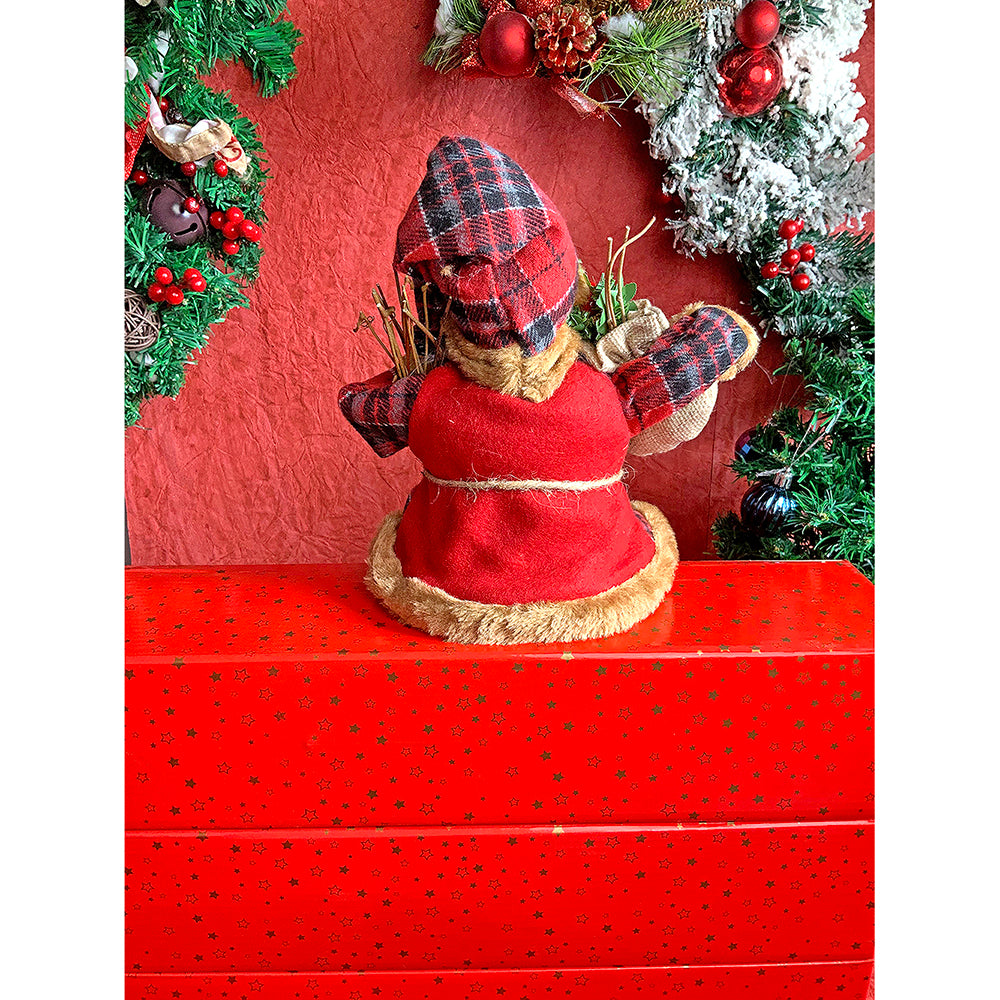 1. Exclusive Design: This Exquisite and overly attractive sitting Santa in classic plaided attire with premium Furry Look holding and adorning the most cutest christmas sack and realistic looking woodn sticks is an eye catcher when placed on any table or your favourite corner of your house to accentuate your christmas decor.